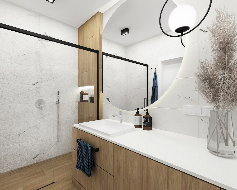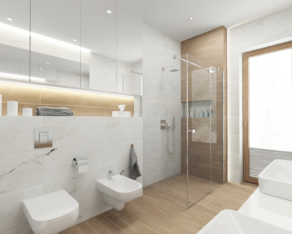 Light-filled bathroom with contrasting white marble-effect and wood-tone tiles, a walk-in shower, and contemporary fixtures.