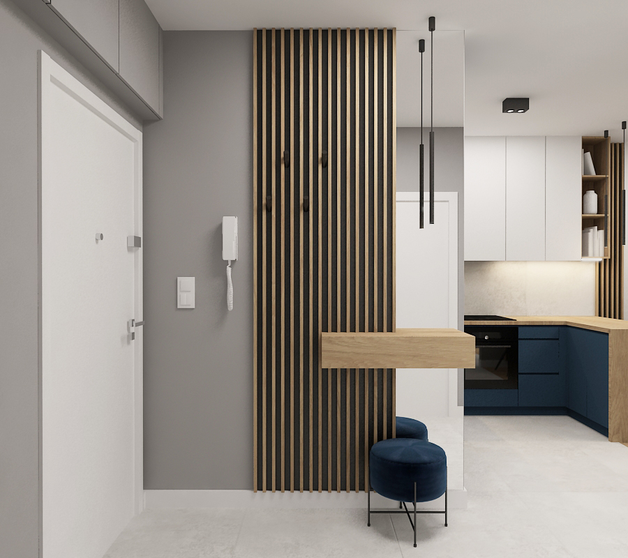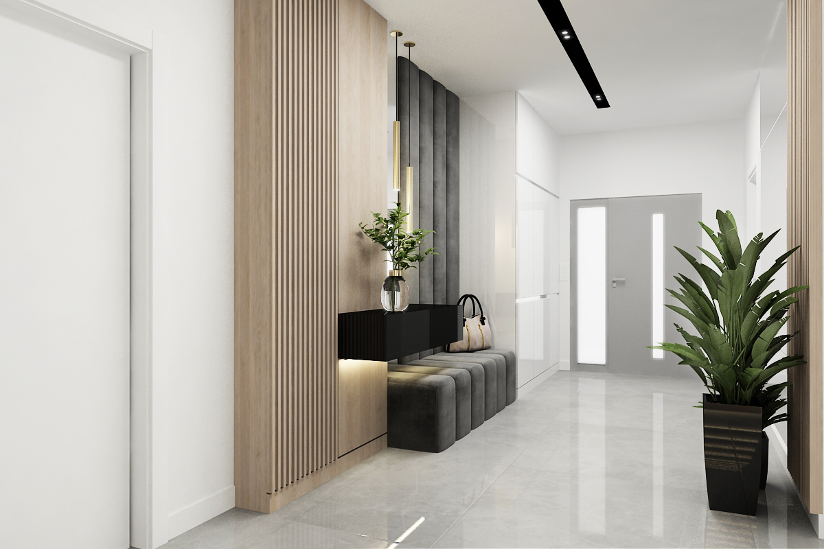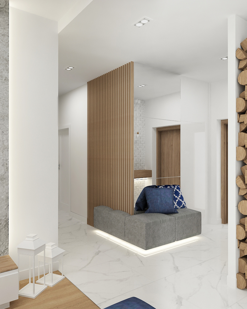 The entryway (wiatrołap) combining a white marble floor with a natural wood slat partition and a built-in seating bench.
