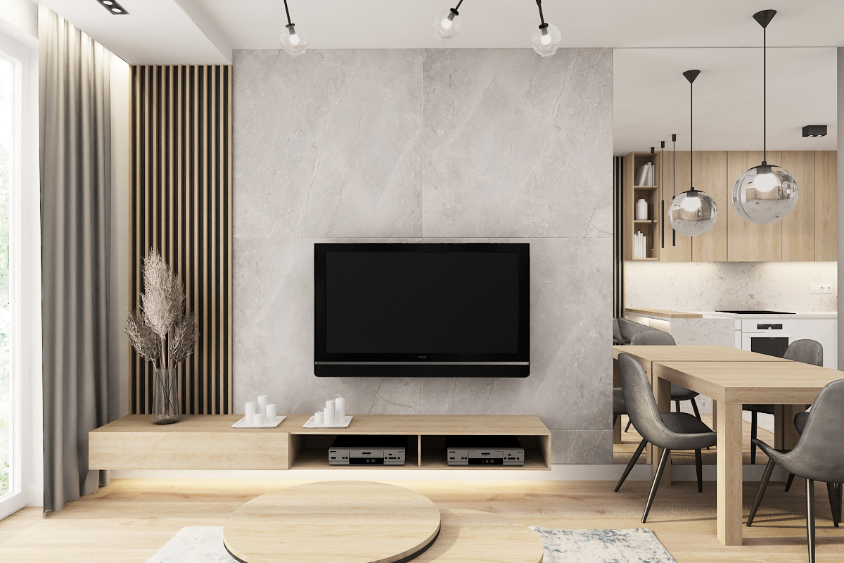 Living room design focused on natural materials, with a wood-paneled media wall, grey sofa, and large windows for natural light.