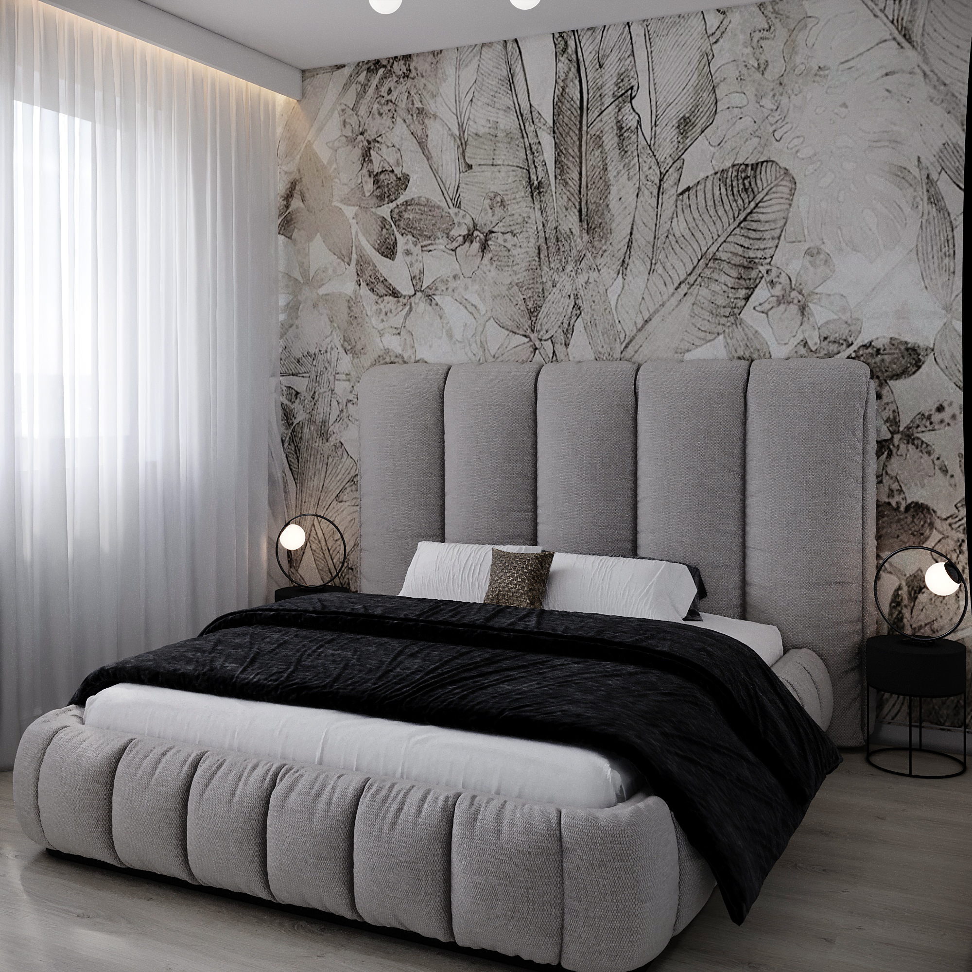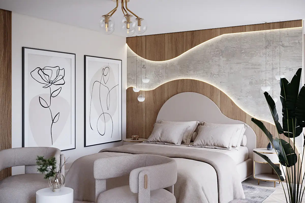 The master bedroom features a soft, plush bed and a custom mural that adds a layer of depth and visual interest to the minimalist design.