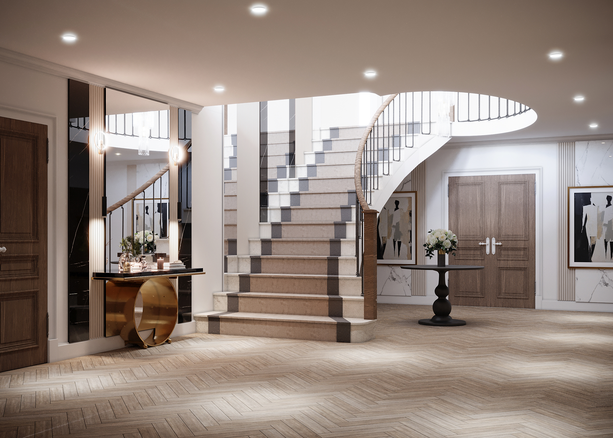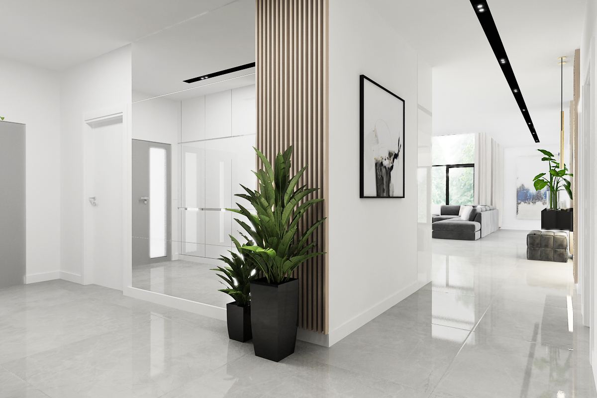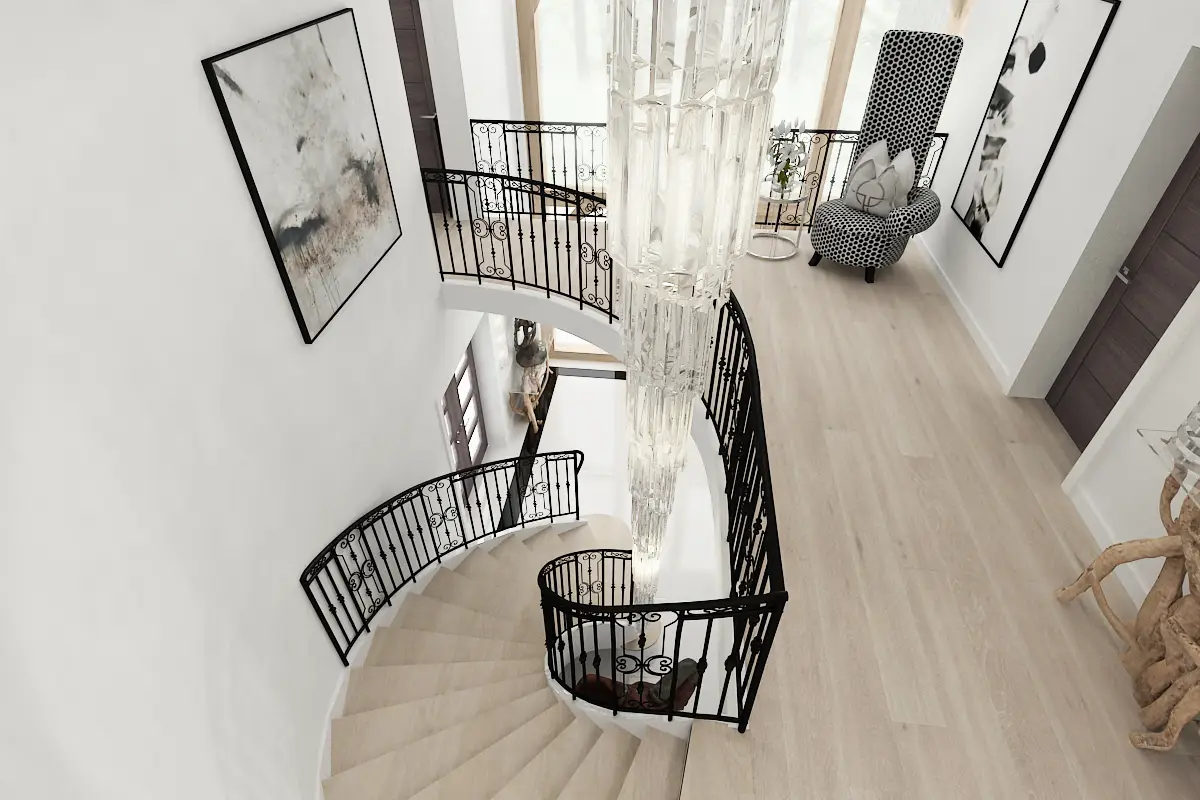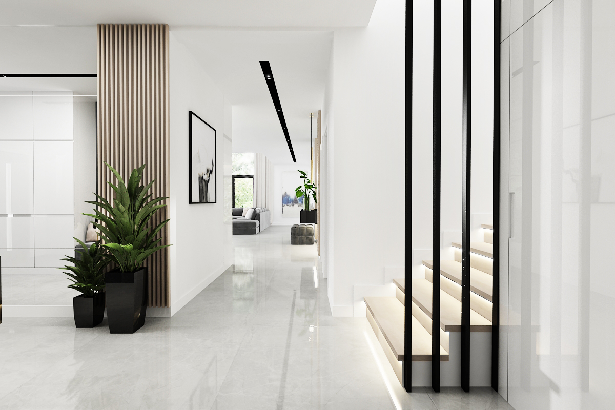A seamless transition from the entrance to the main living area, defined by clean lines and the stunning vertical element of the open staircase.