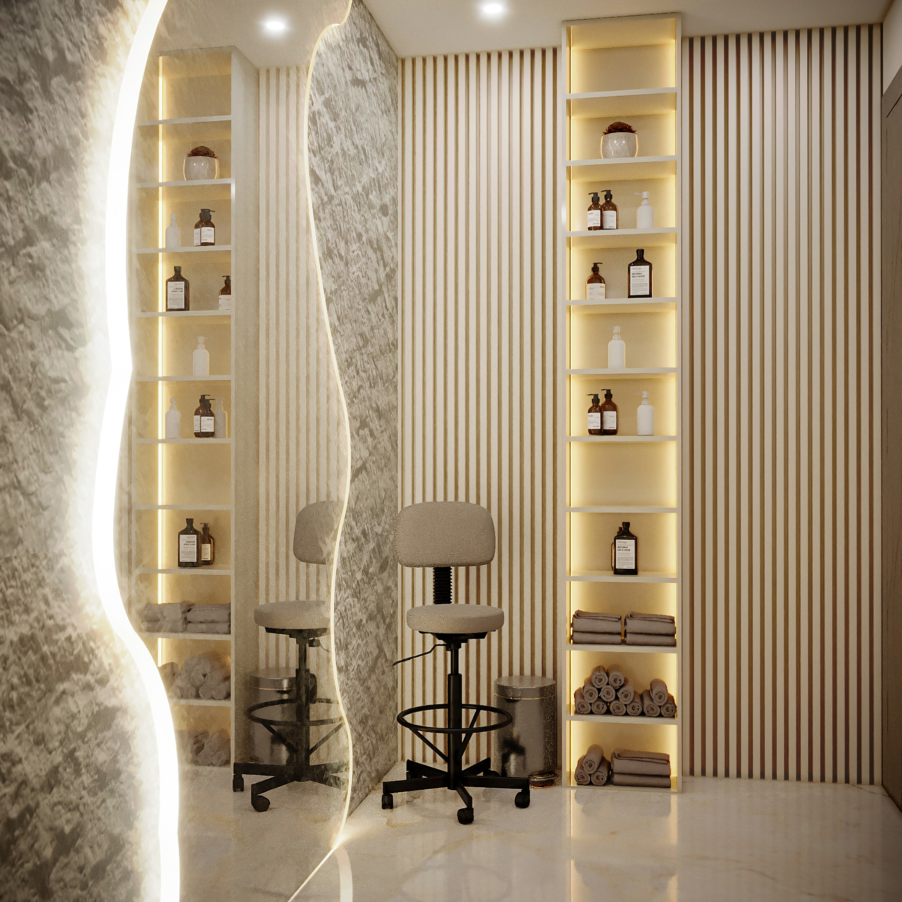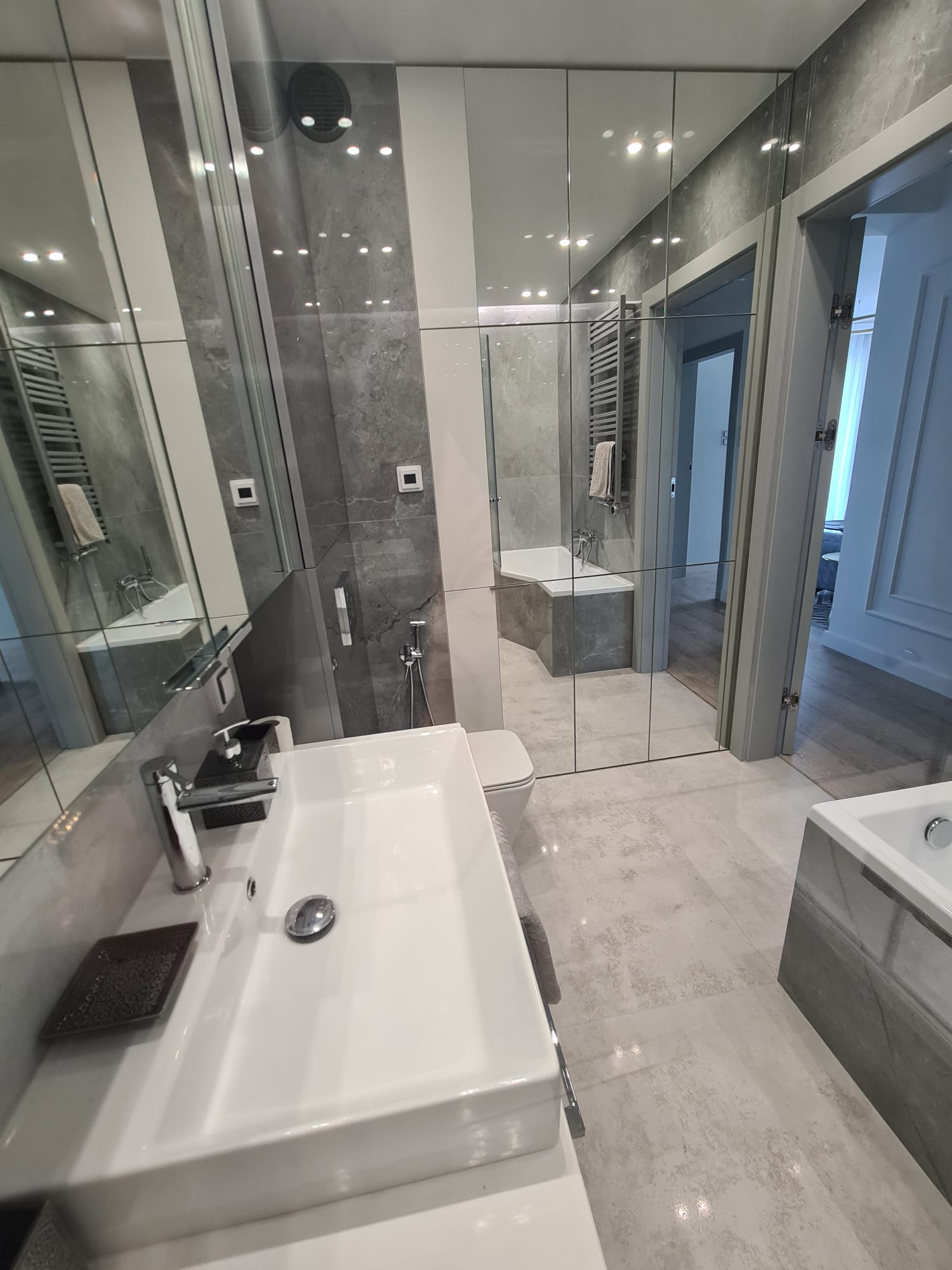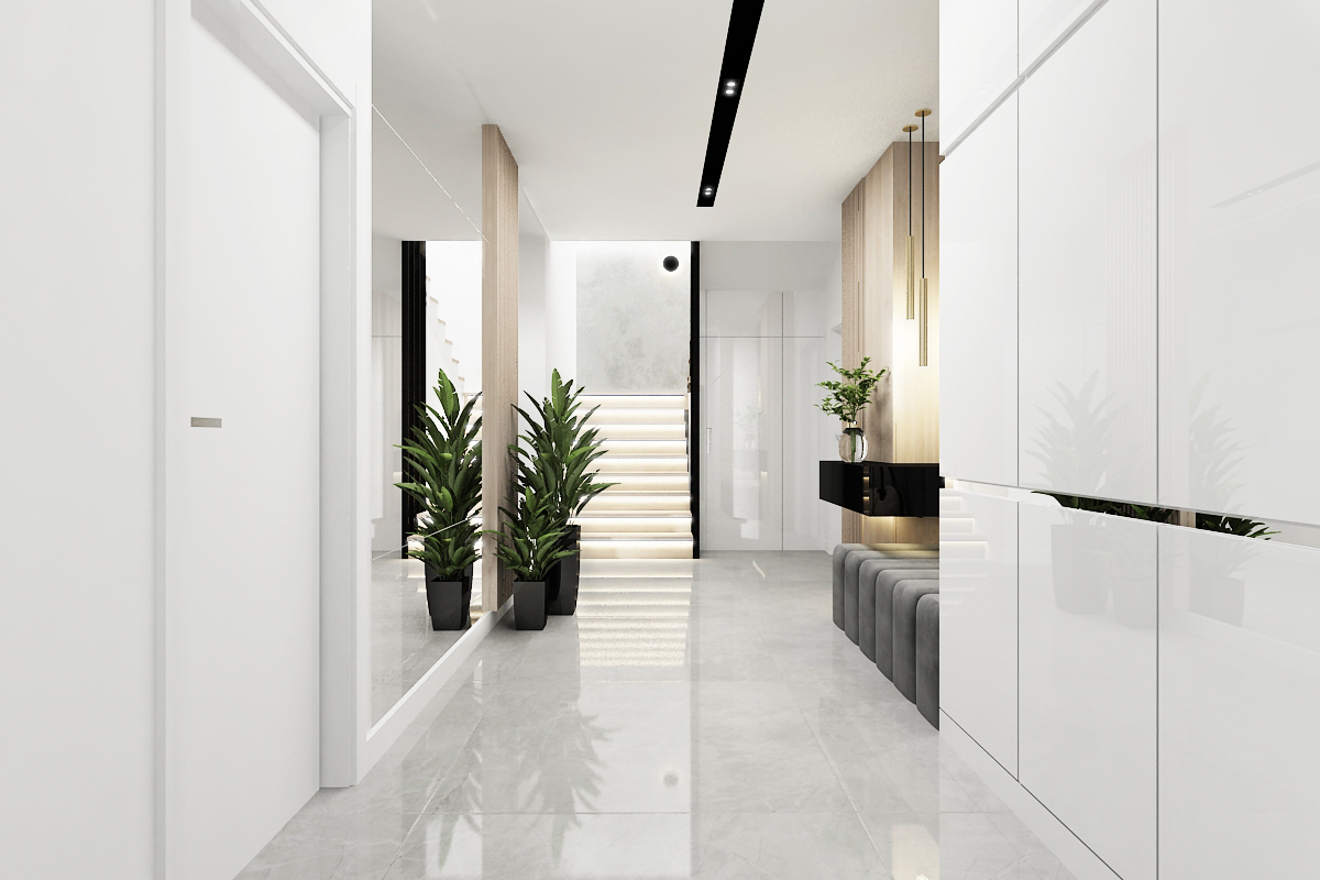 Reflective surfaces, like the full-height mirror and polished floors, are used strategically to amplify light and space in the minimalist corridor.