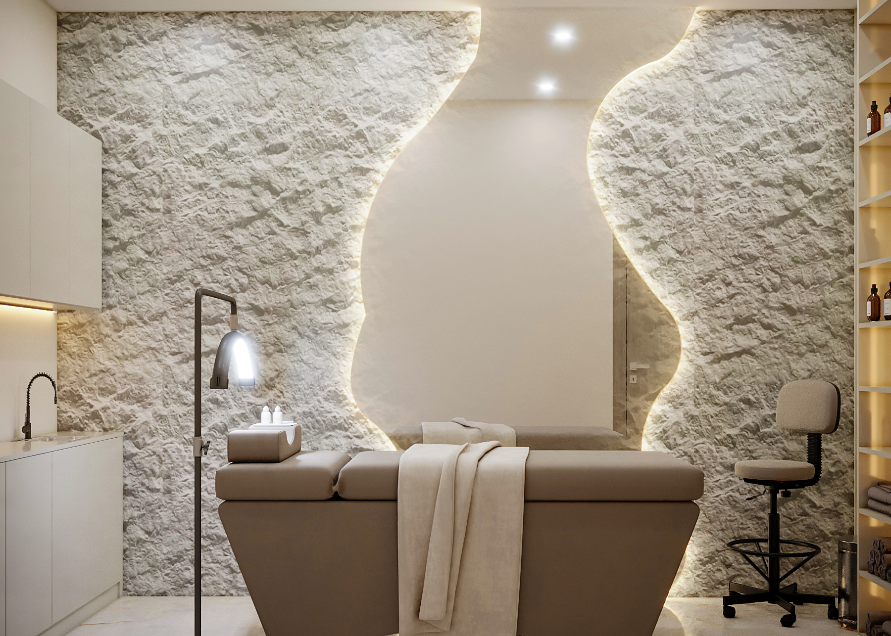 The master suite is a sanctuary of textures: soft velvet upholstery, plush rug, and recessed LED lighting creating a serene, luxurious mood.