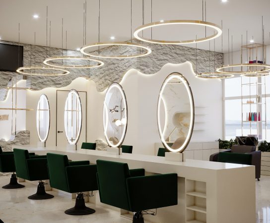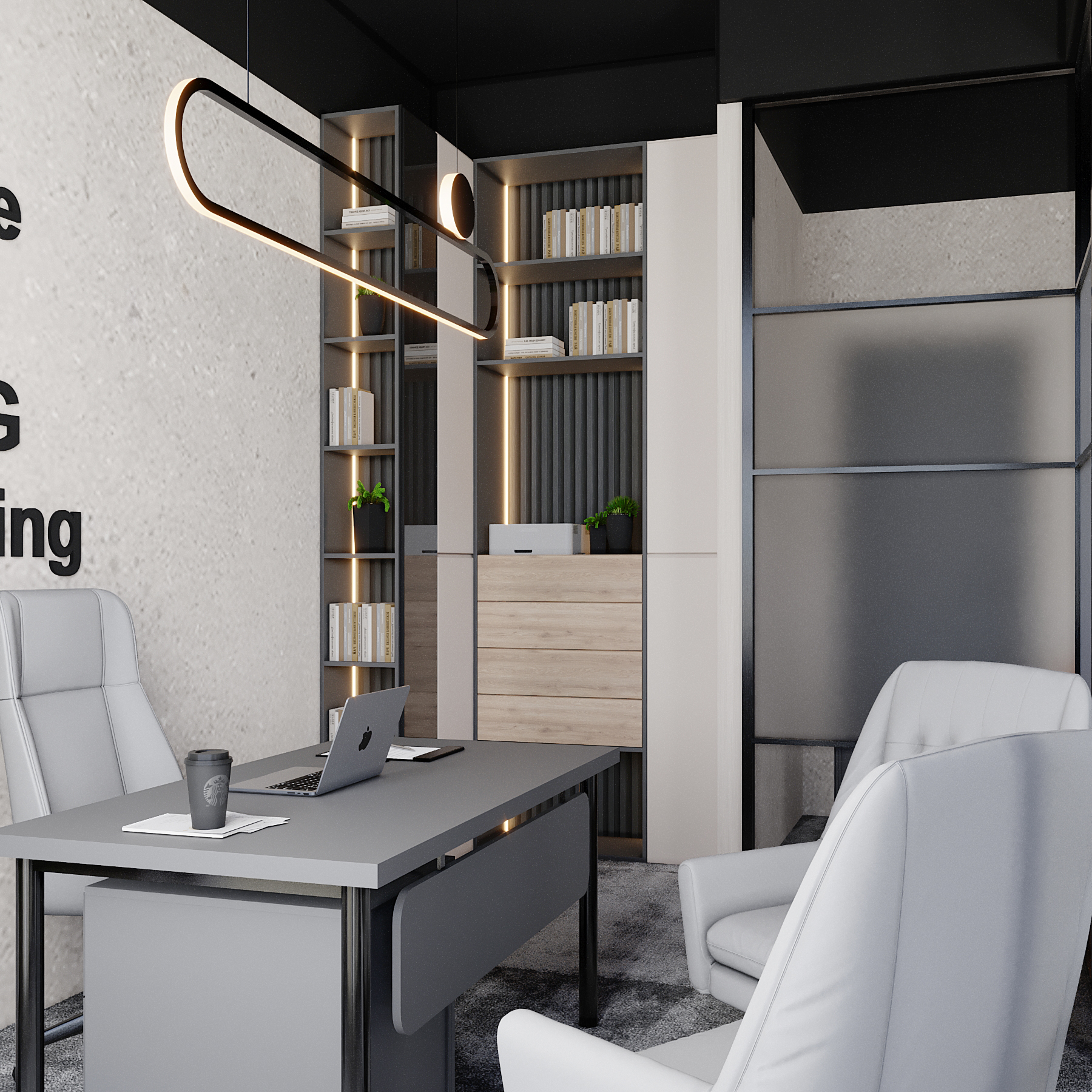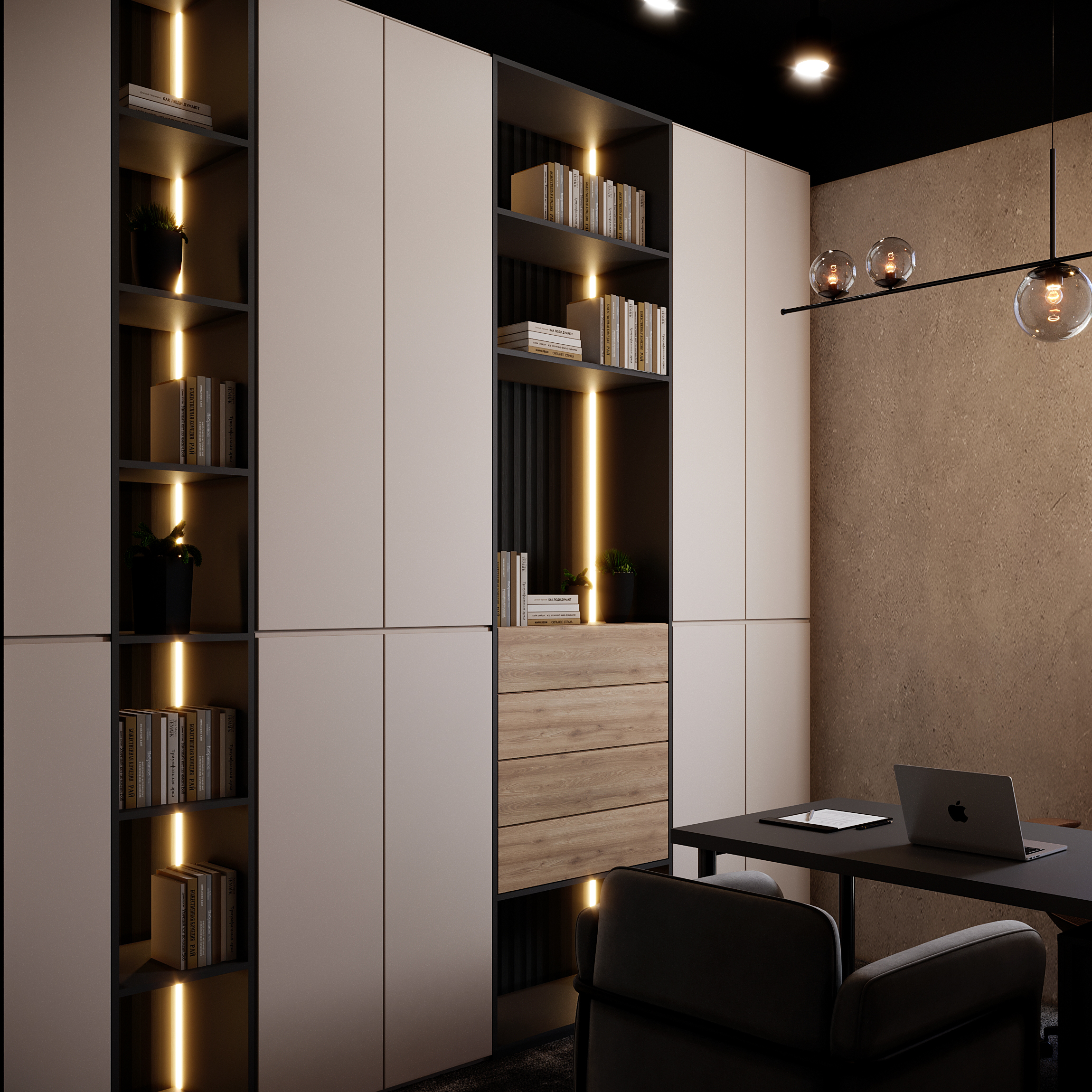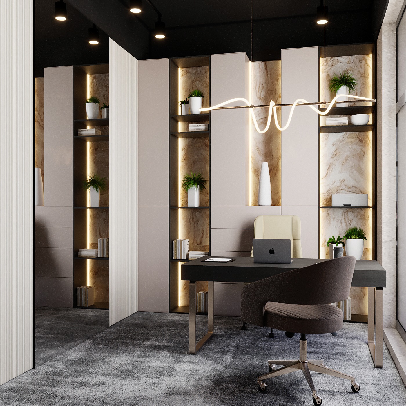 Contemporary Executive Space: A luxurious executive office featuring a dark, large desk, ambient LED strip lighting on shelving, and striking circular pendant lights overhead.