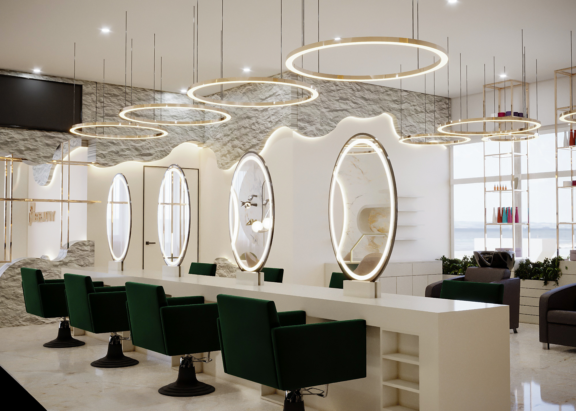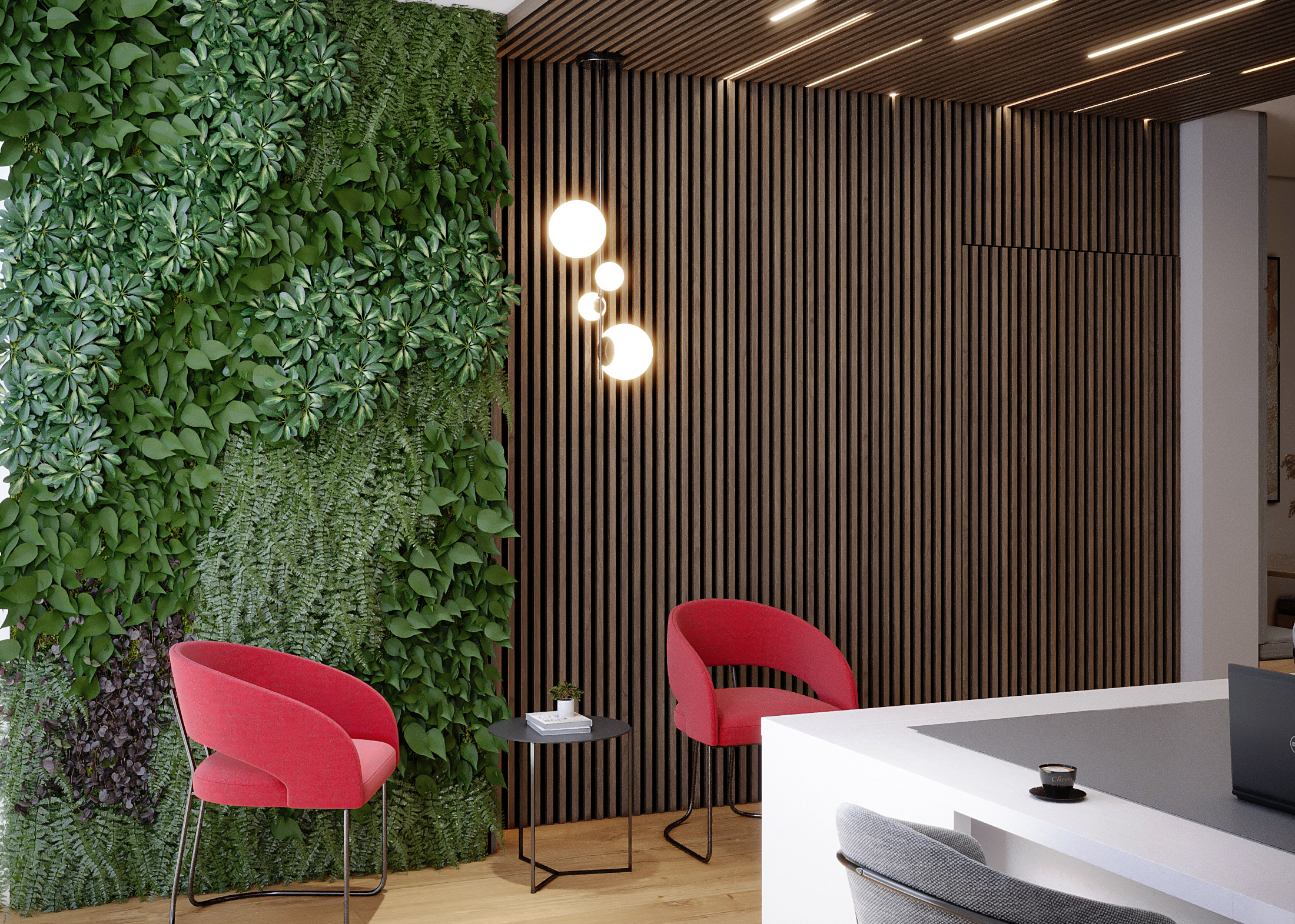 Flow and Focus: An open perspective showing the transition from the natural green wall waiting area into the bright, modern main office workspace, maintaining a cohesive color palette.