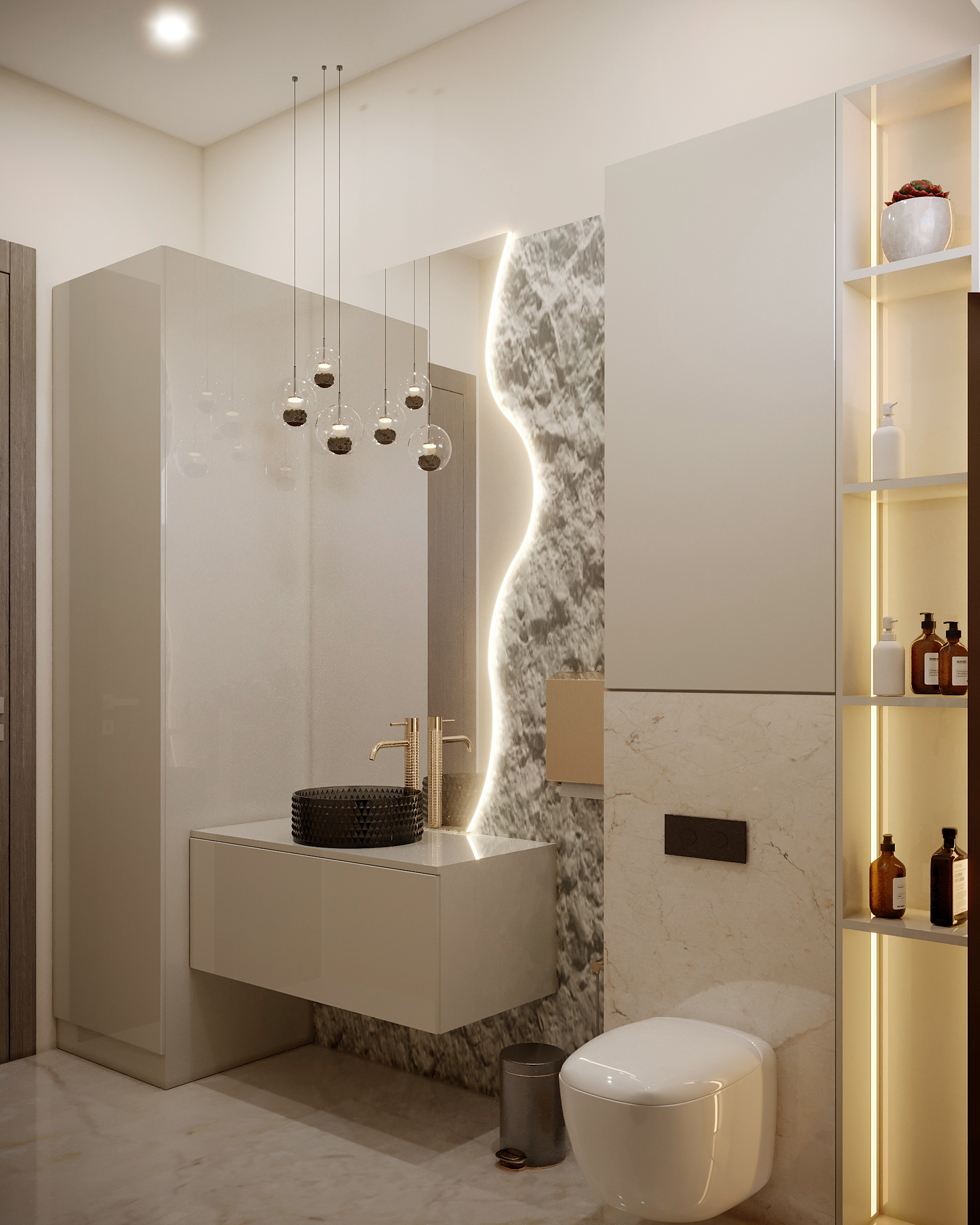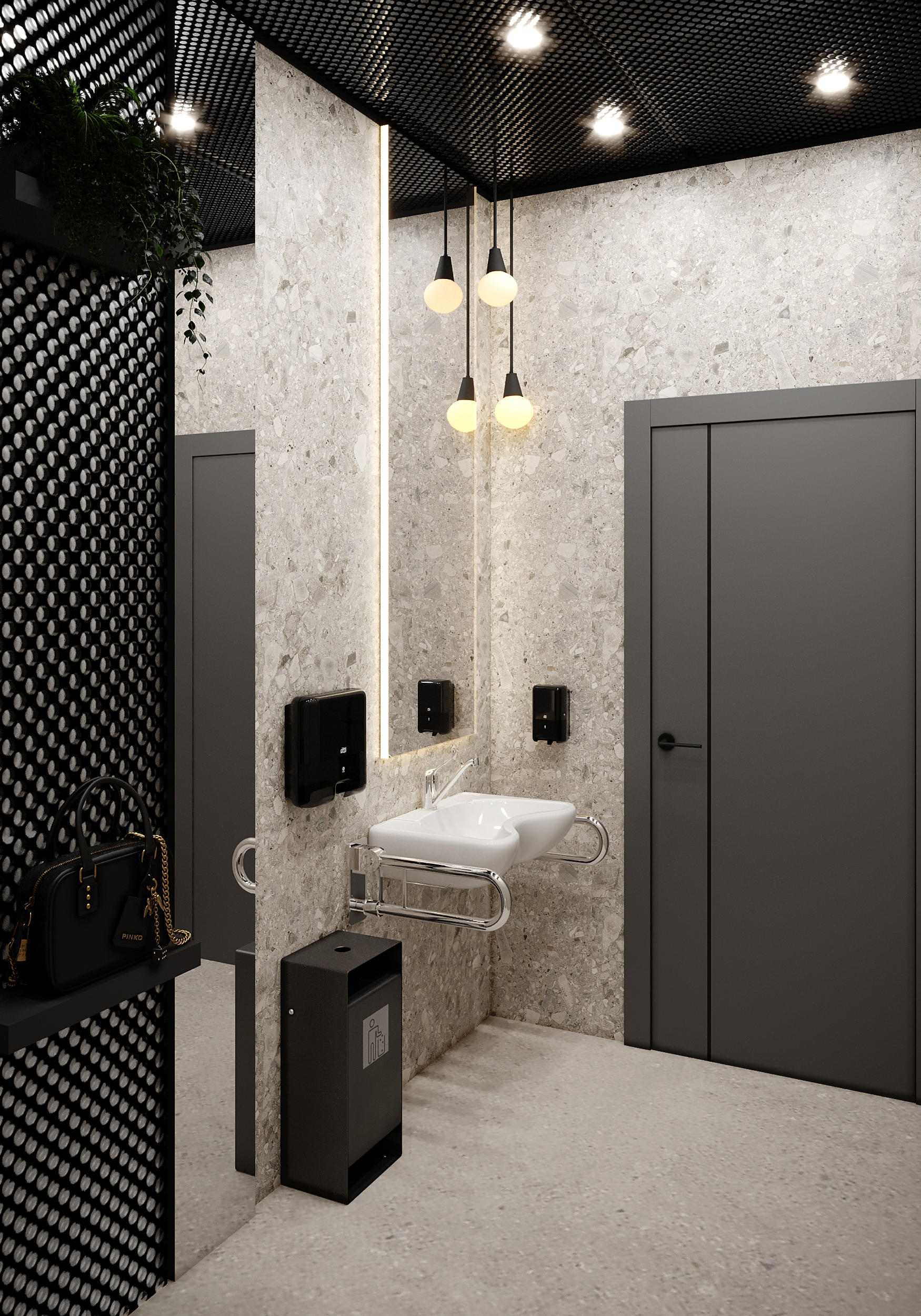 Contemporary ladies’ restroom design blending light terrazzo with black accents, featuring a sink with support rails and unique multiple hanging pendant lights.