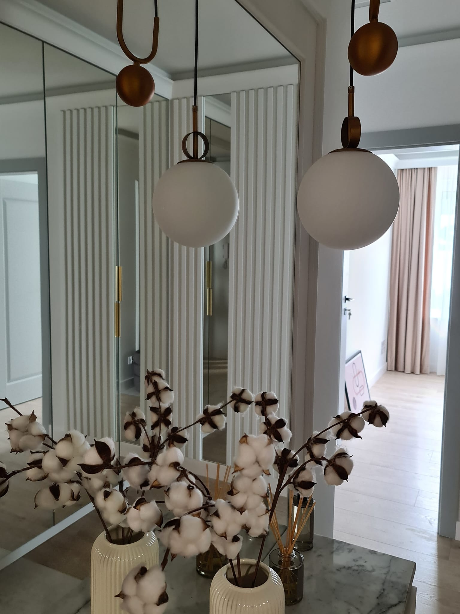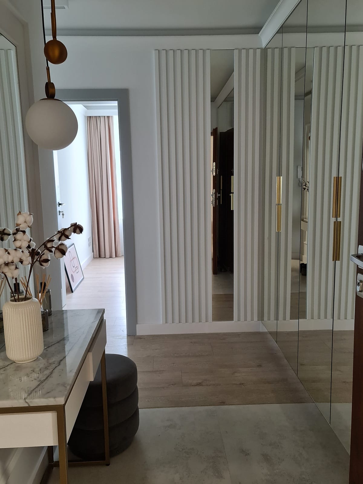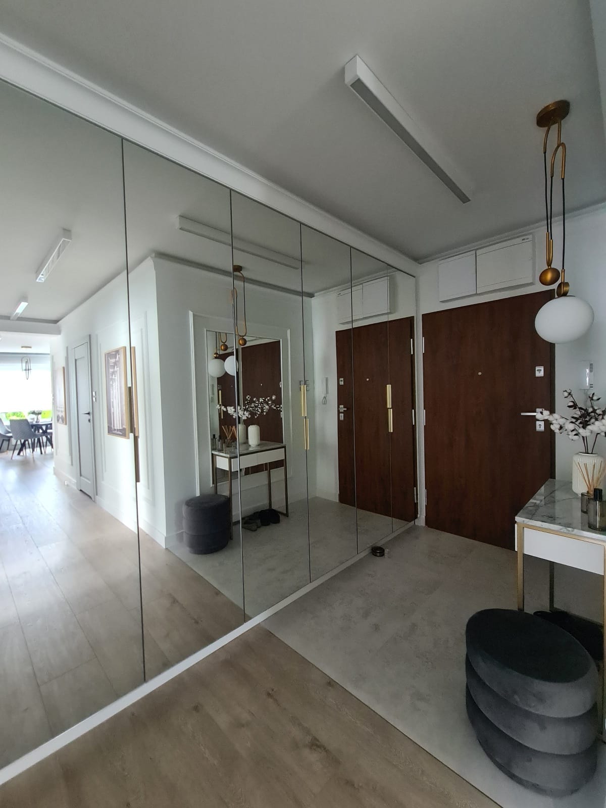 An entryway with mirrored closet doors and elegant gold handles, serving to disguise storage and reflect light, making the apartment feel wider immediately upon entry.