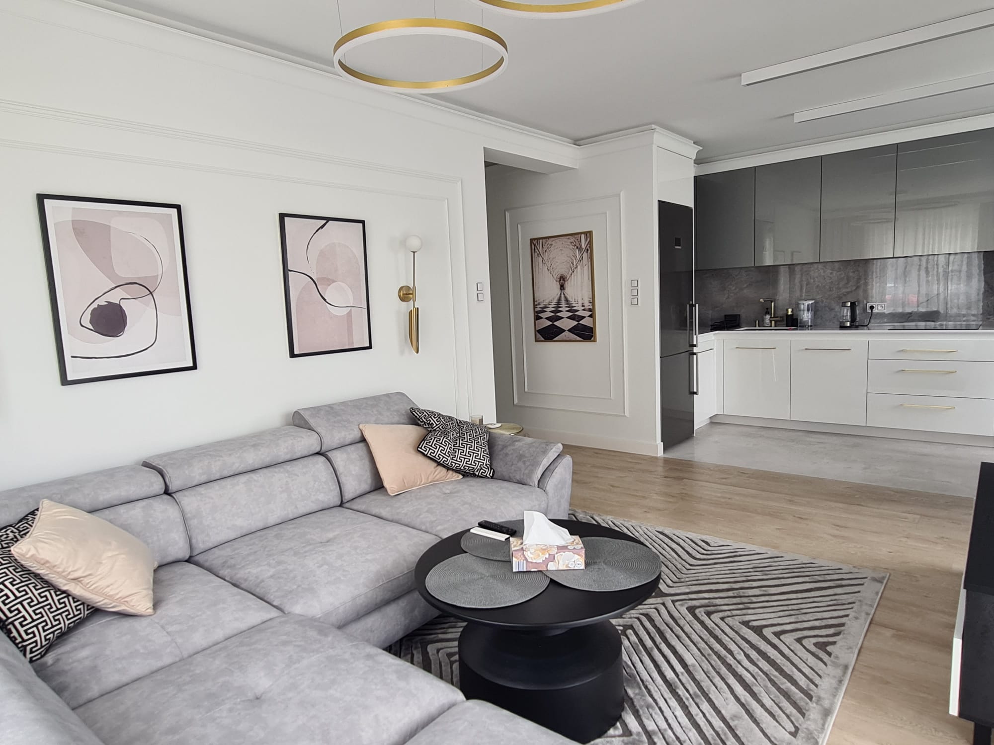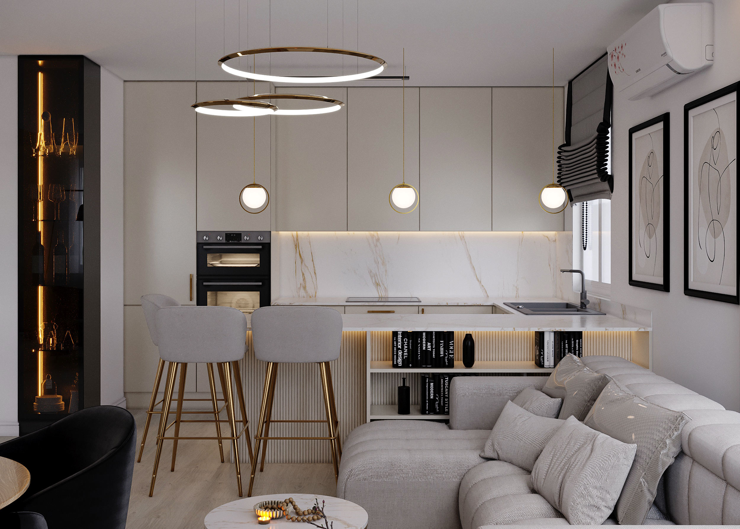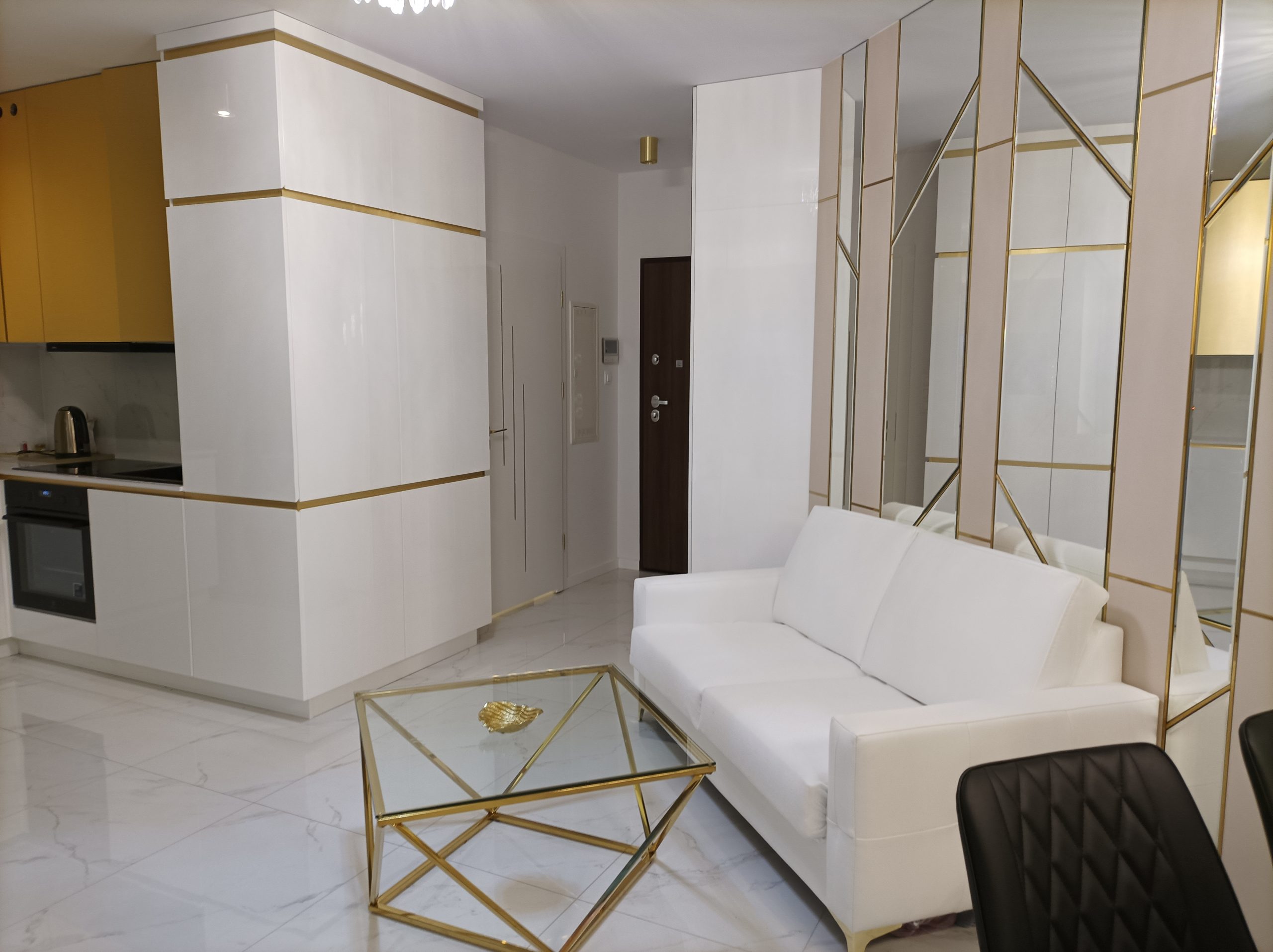 The compact, high-gloss white kitchen with gold accents and hardware blends seamlessly into the living space, providing ample storage with a luxurious finish.