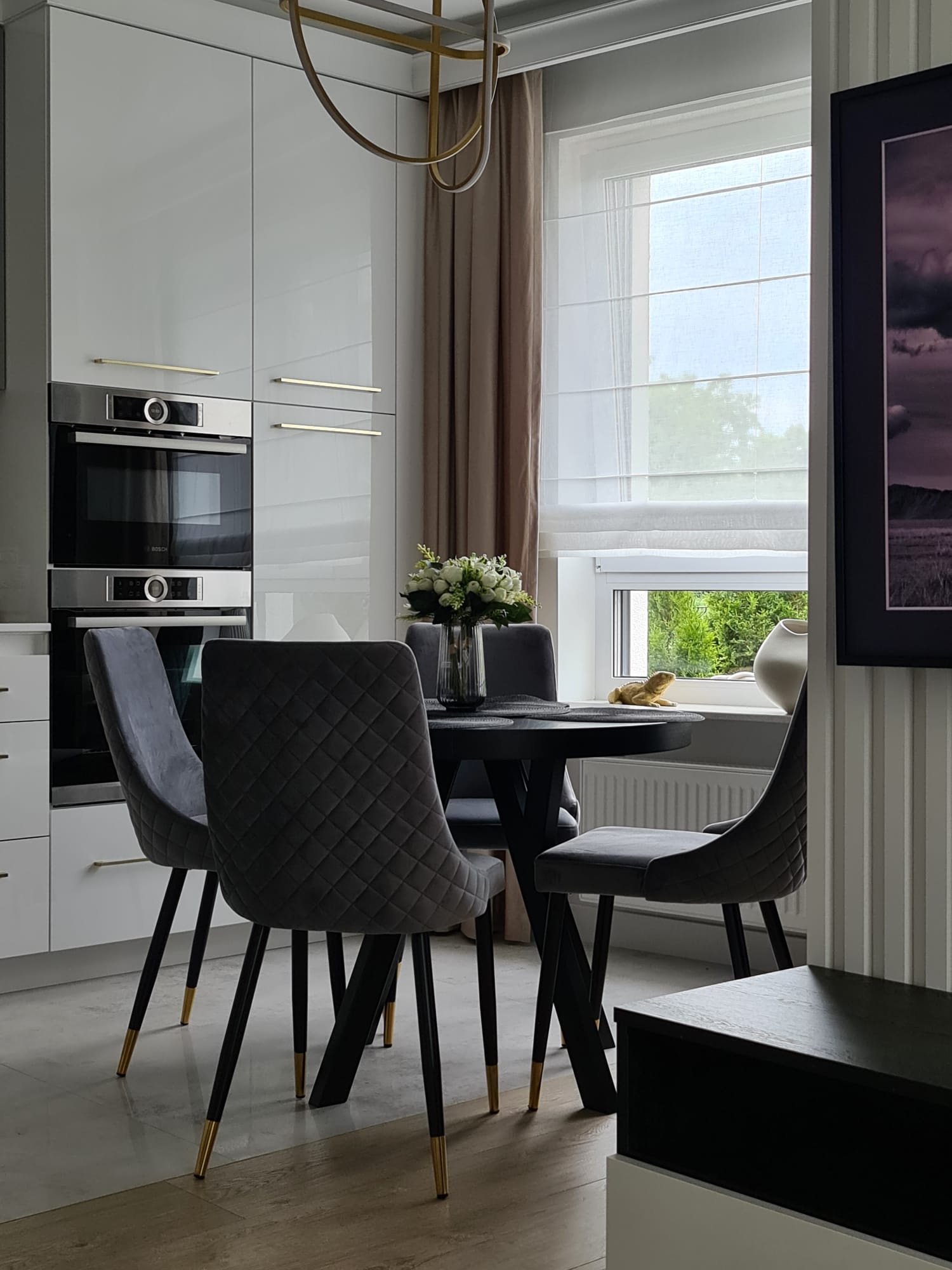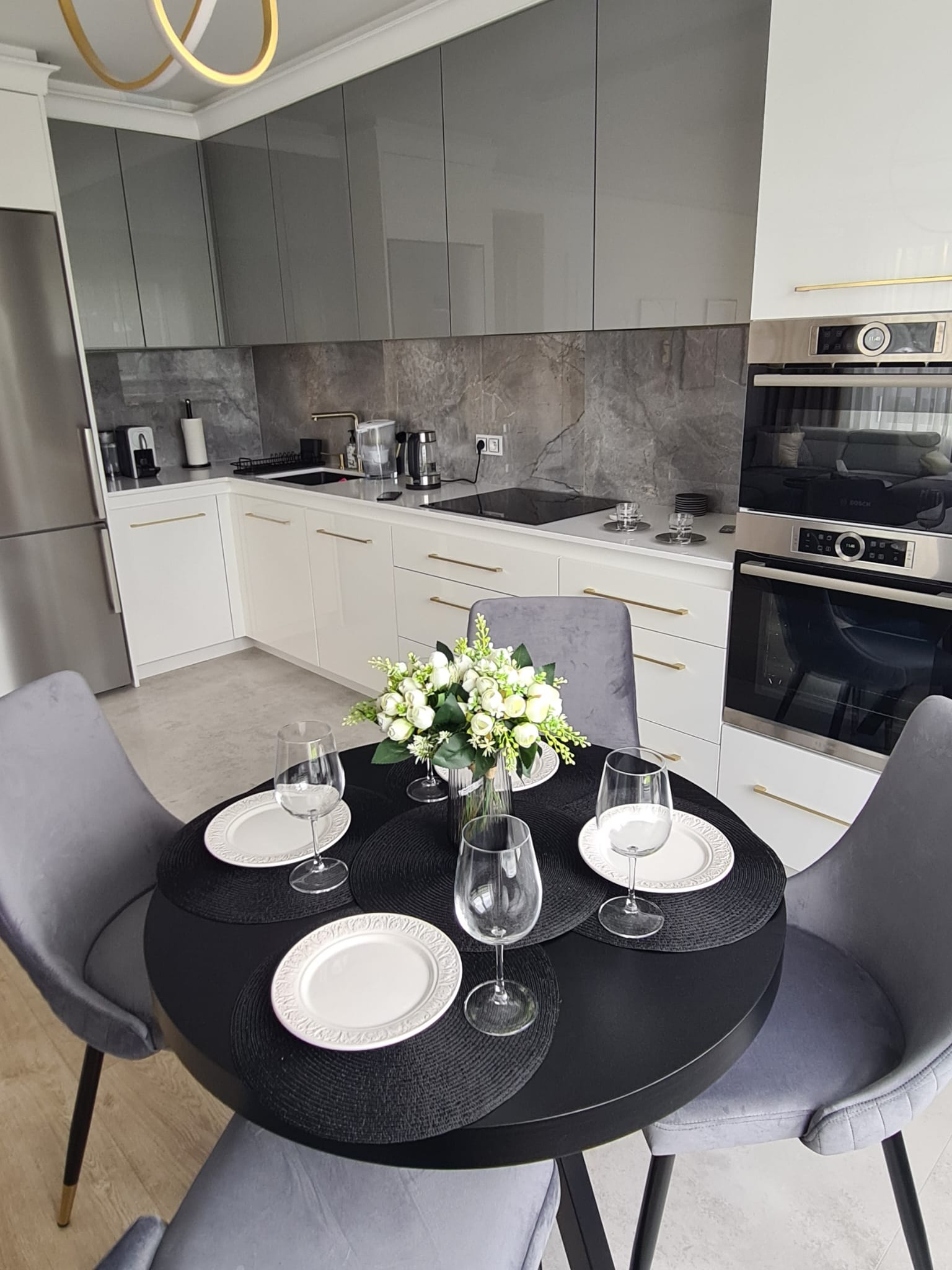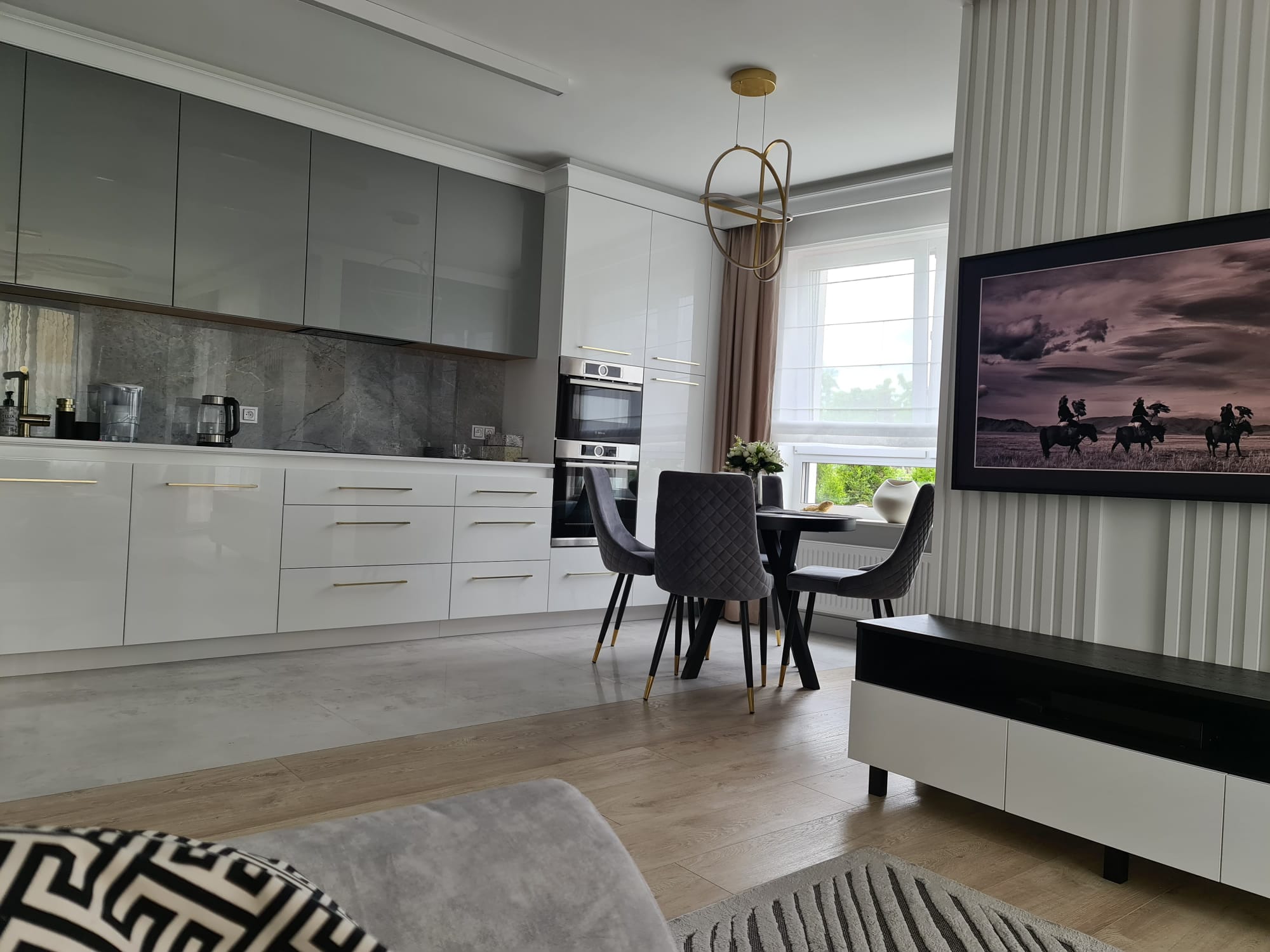 The compact, high-gloss white kitchen with gold accents and hardware blends seamlessly into the living space, providing ample storage with a luxurious finish.