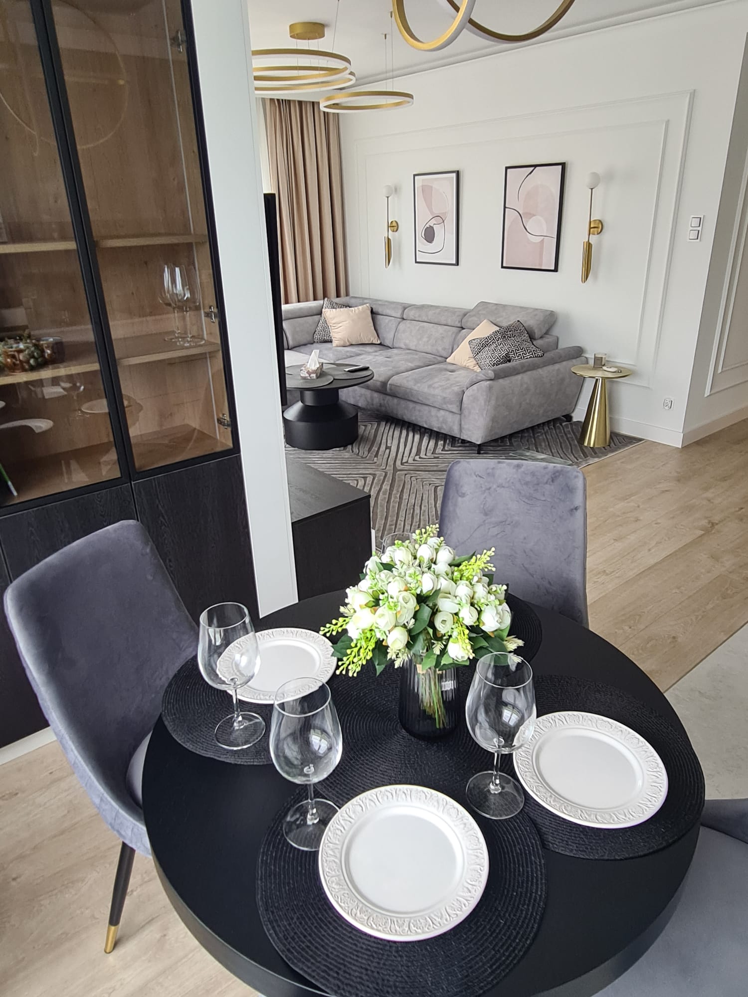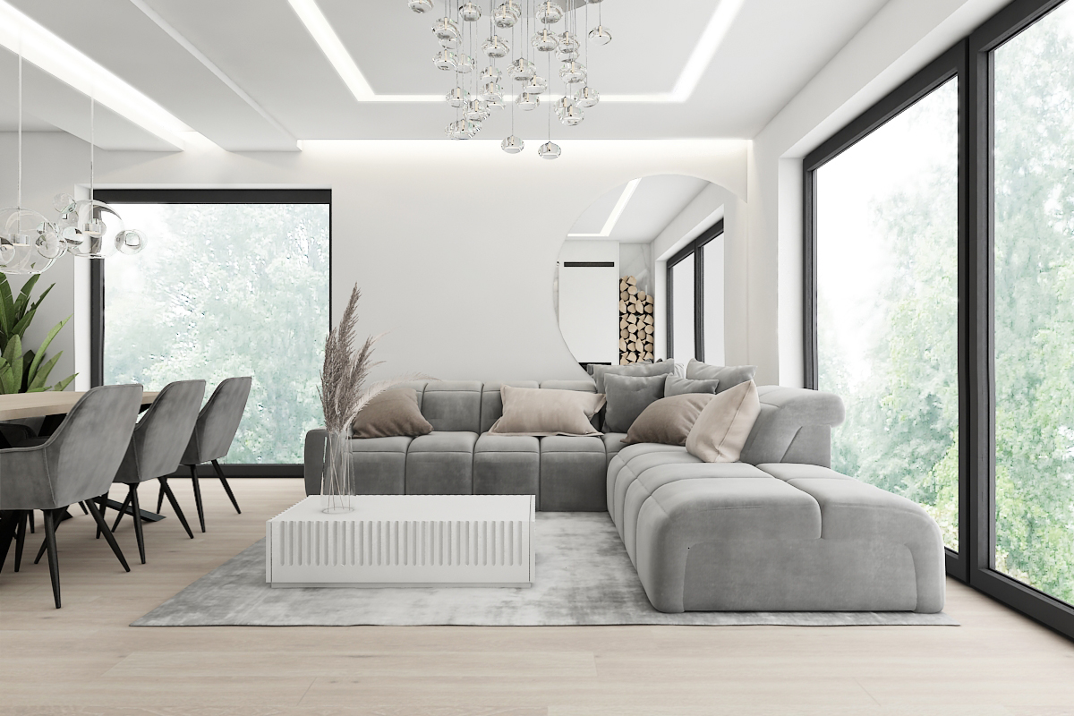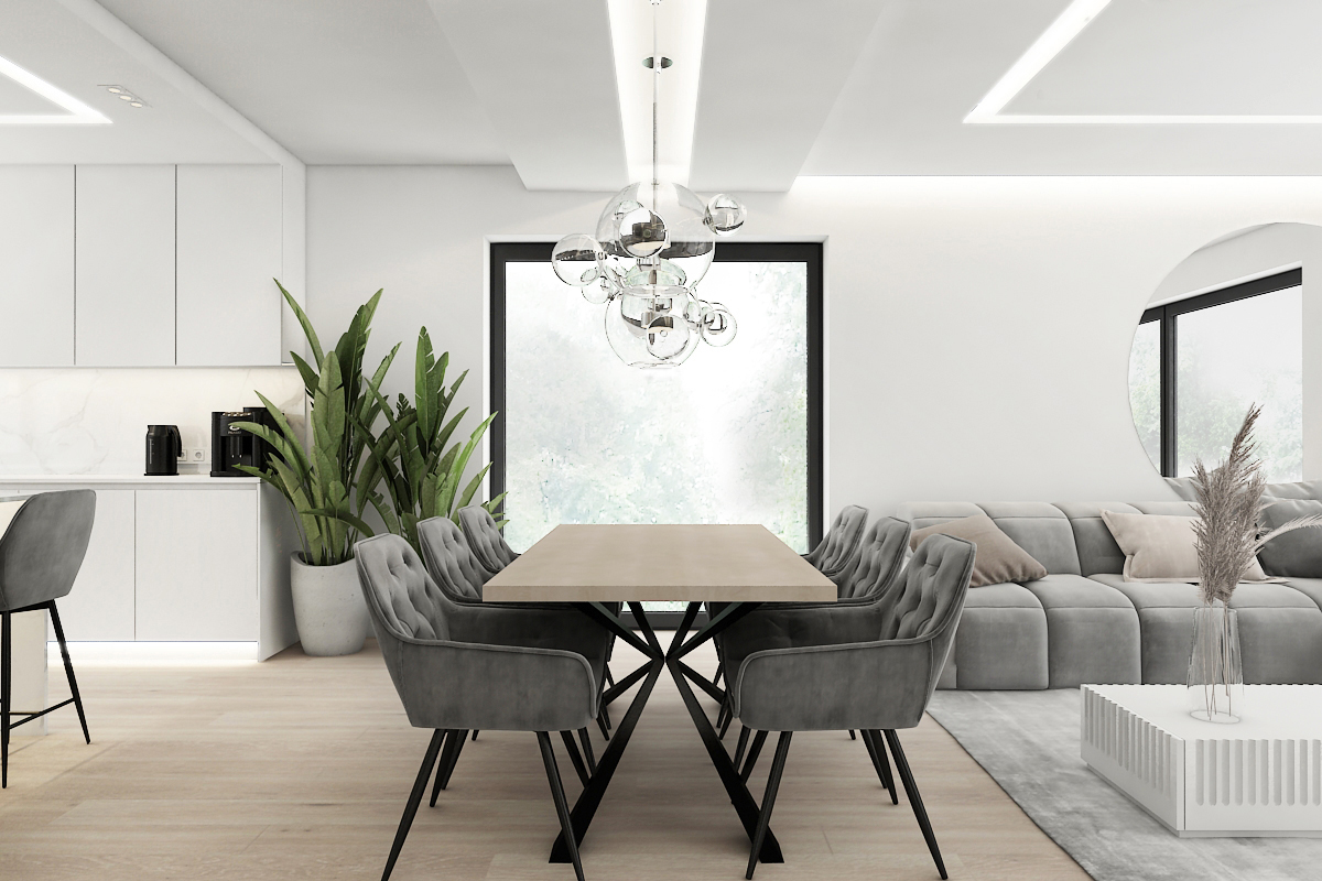 The social zone of the apartment: an open-concept layout that flows between the comfortable, light-grey living area and the dining space.