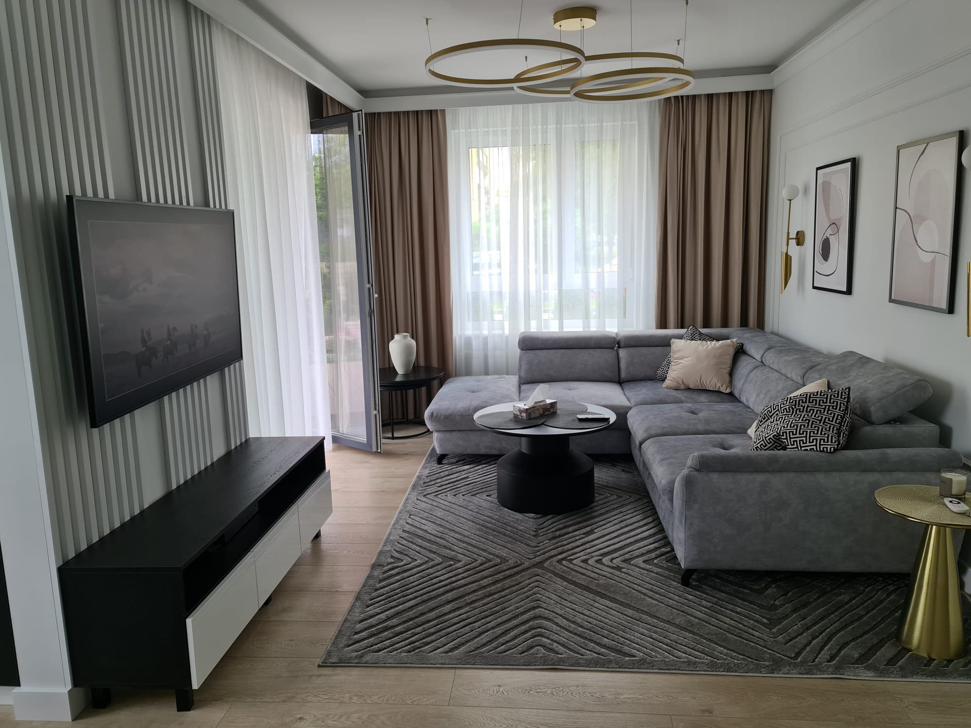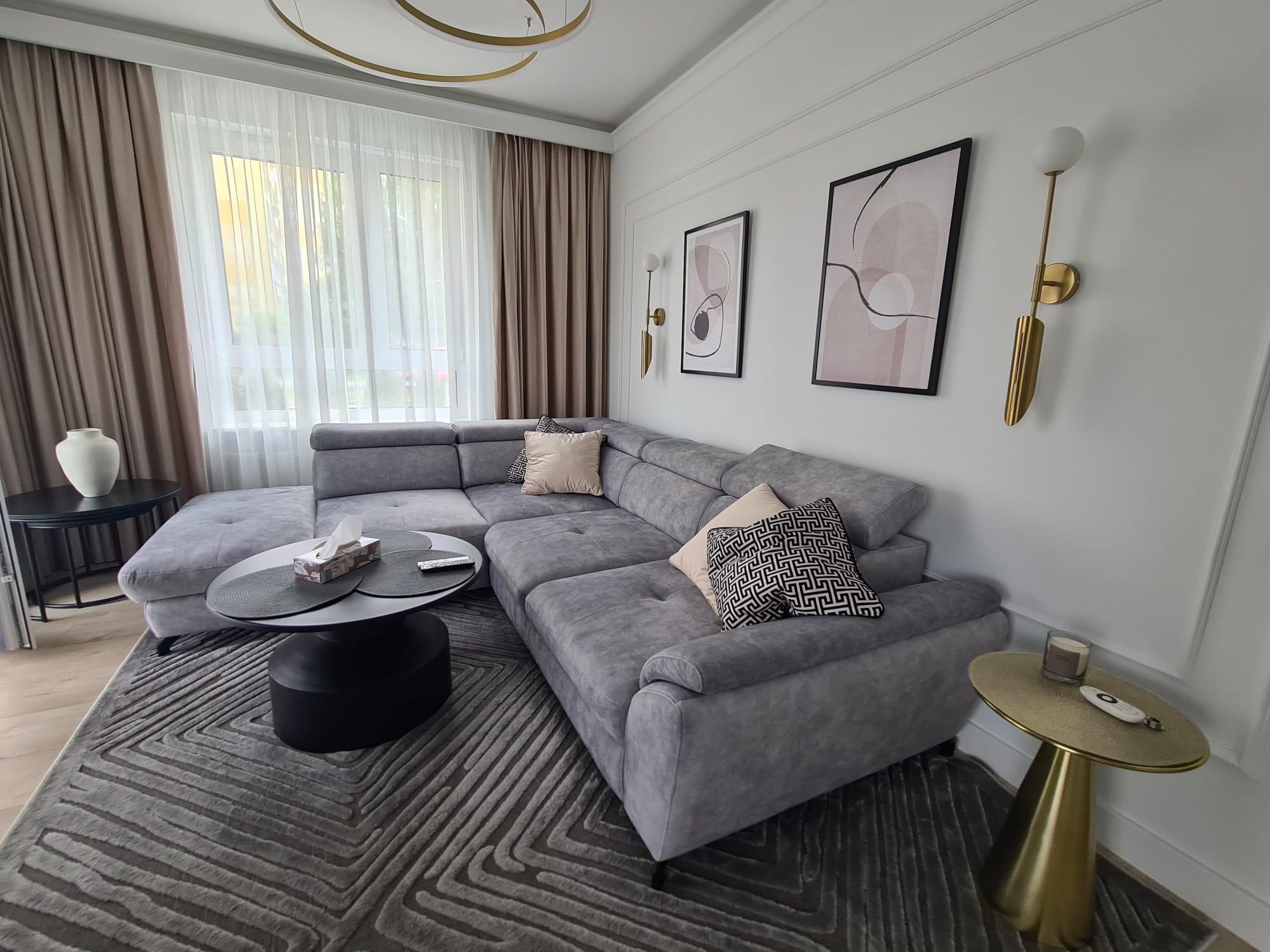 The elegant white sofa paired with a contemporary, angular glass and gold coffee table serves as the luxurious focal point of the living room.