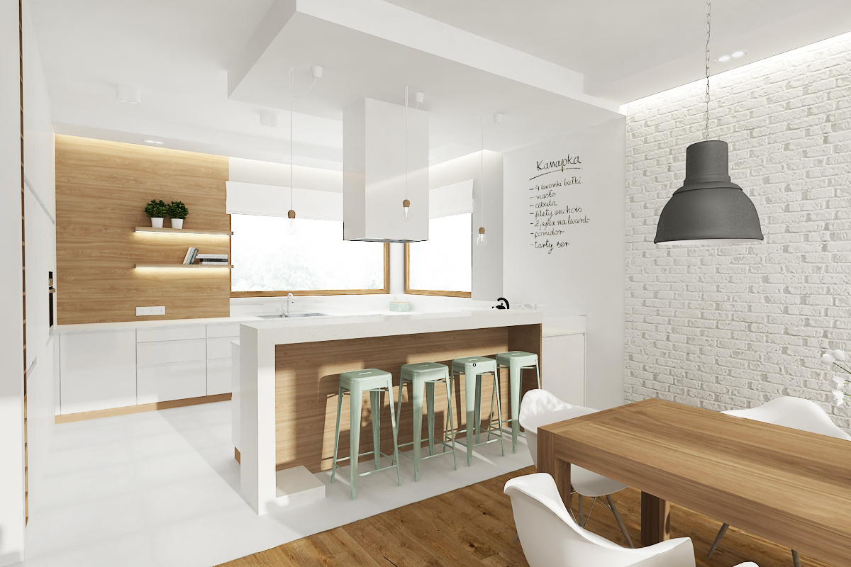 Bright, Scandinavian-style kitchen with a central island/bar, white cabinetry, wood accents, and a feature white brick wall.