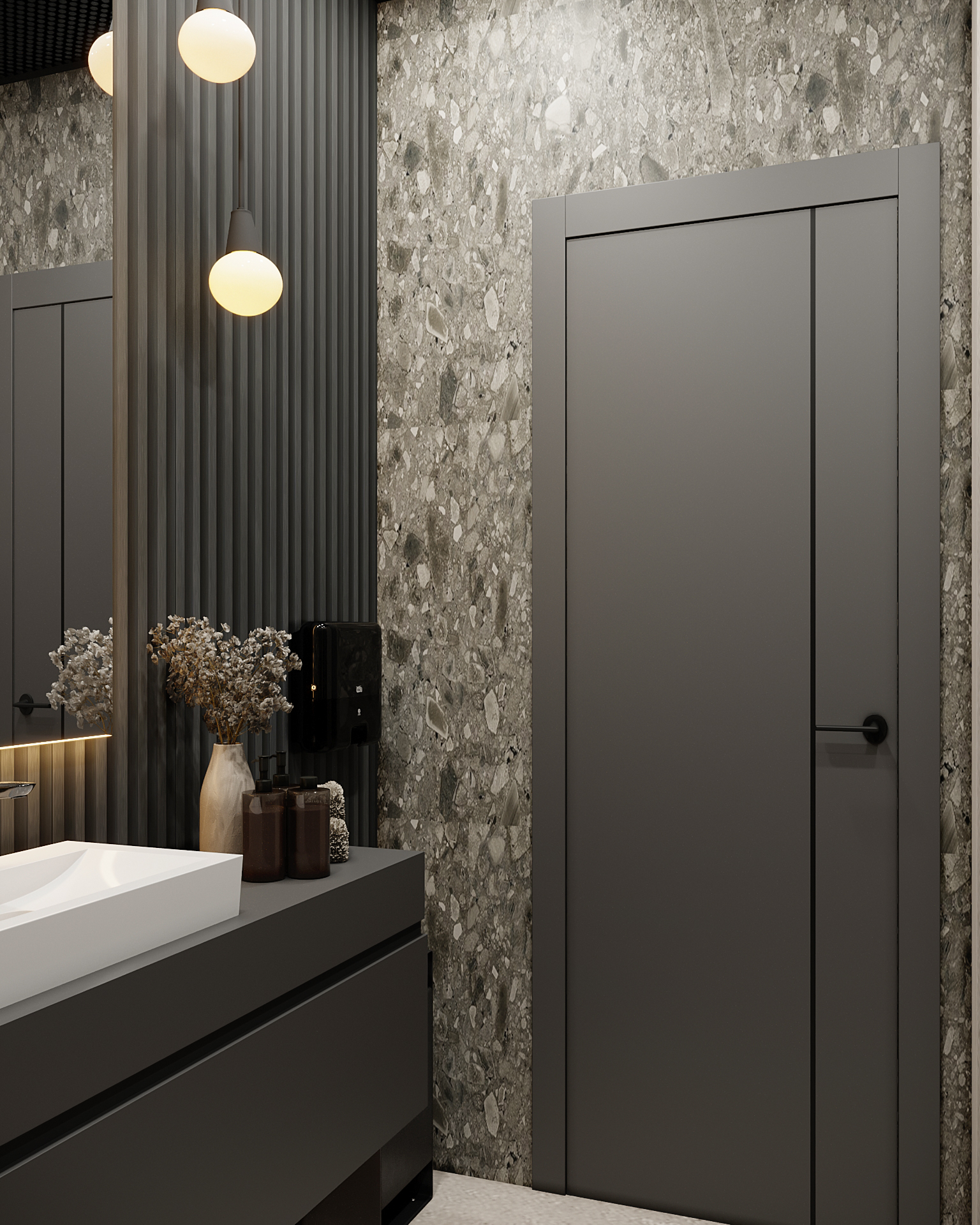 Sleek commercial restroom interior featuring a dark gray vanity, stylish pendant lights, and high-contrast terrazzo-effect stone wall tiles.