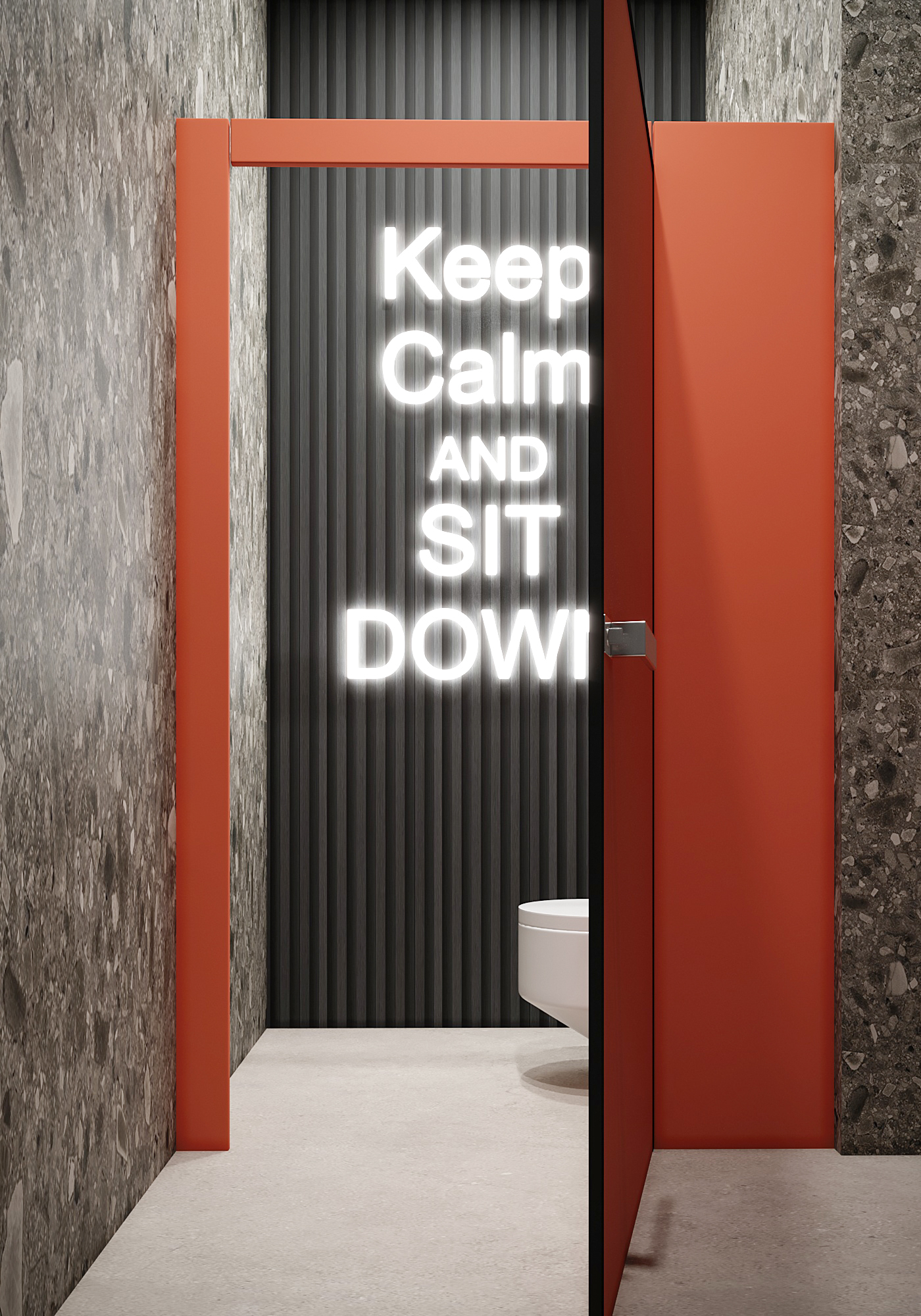 Bold and playful design for a commercial men’s restroom: orange accents, textured dark wall, and a humorous “Keep Calm and Sit Down” neon light.