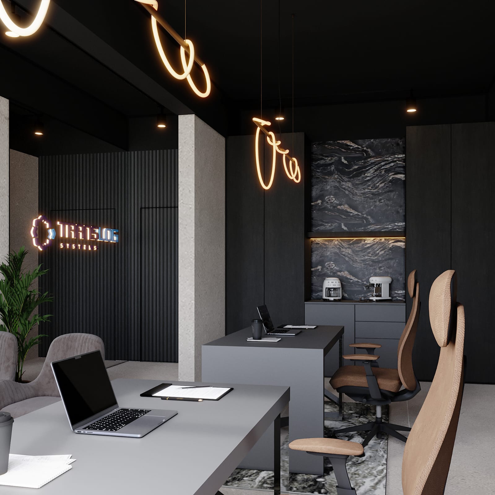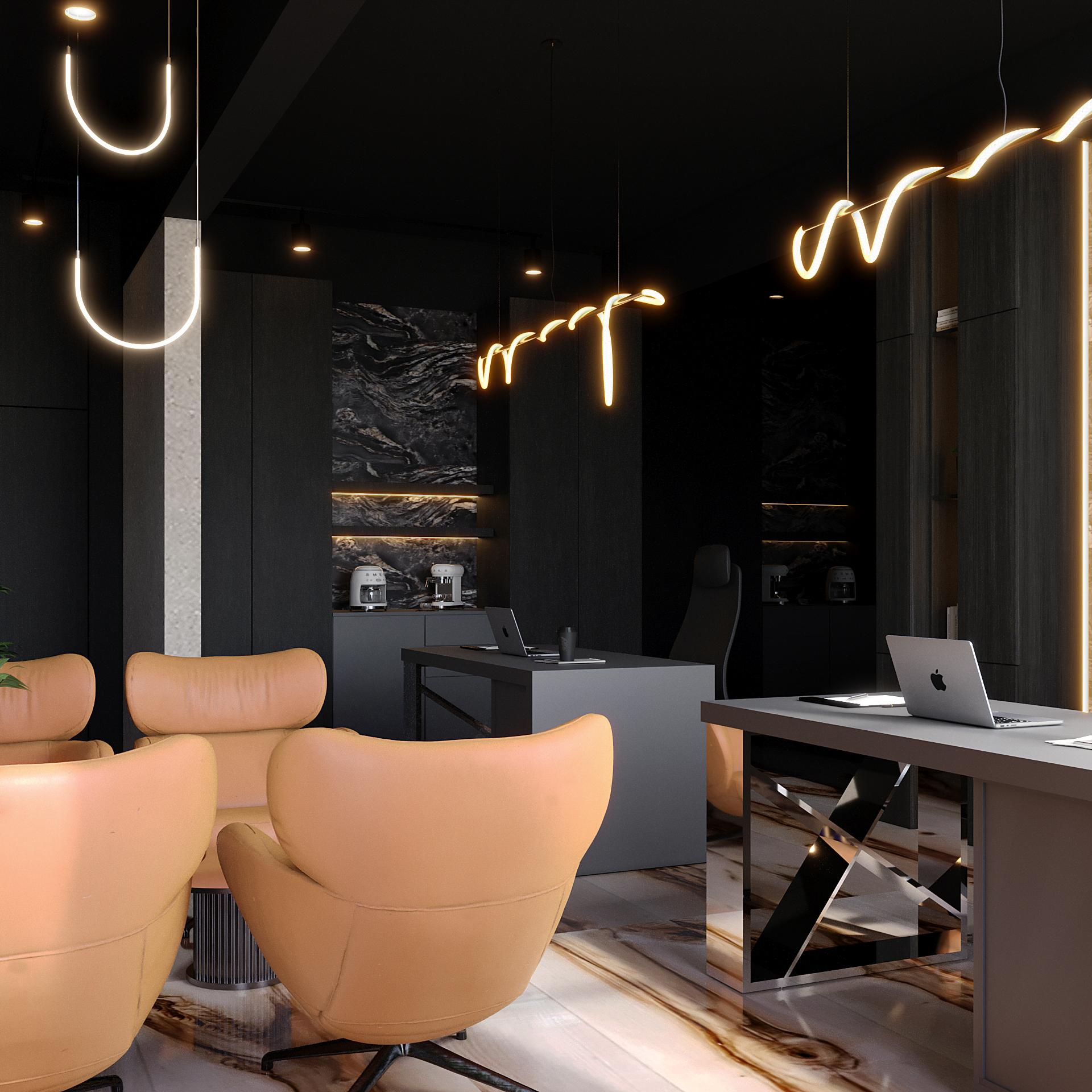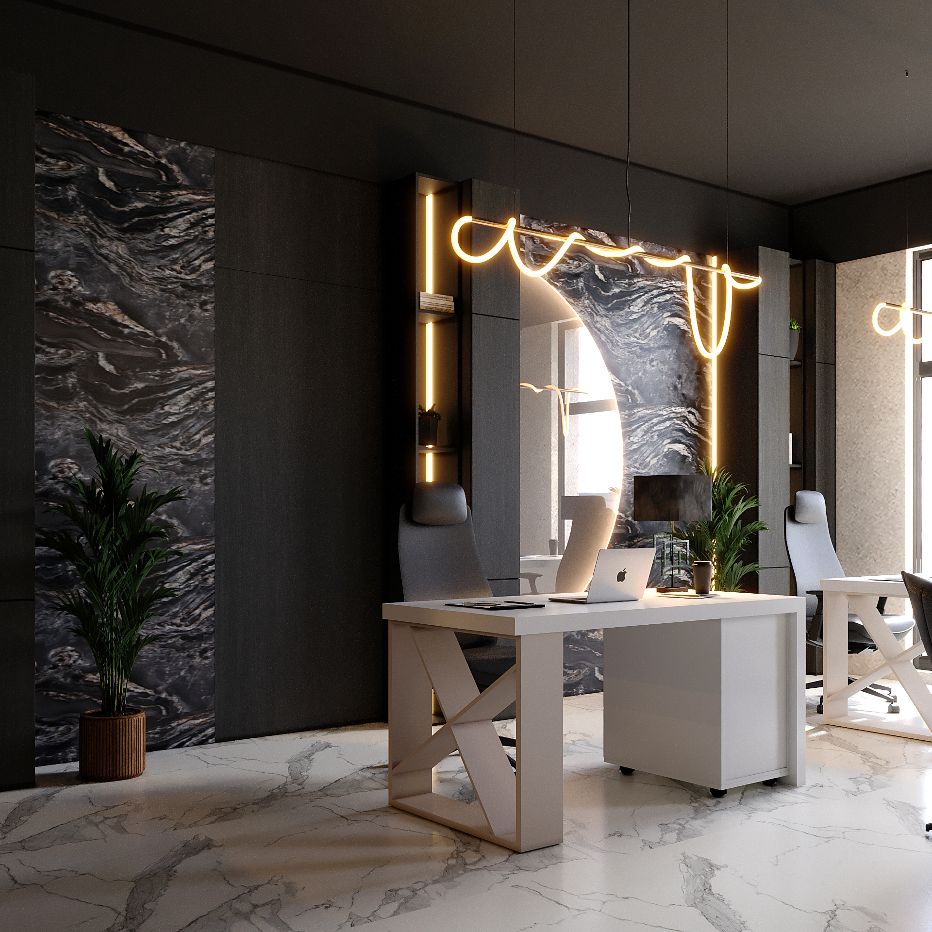 Executive office design emphasizing luxury and modern minimalism, featuring dark, dramatic marble, unique ambient neon lighting, and high-end finishes.