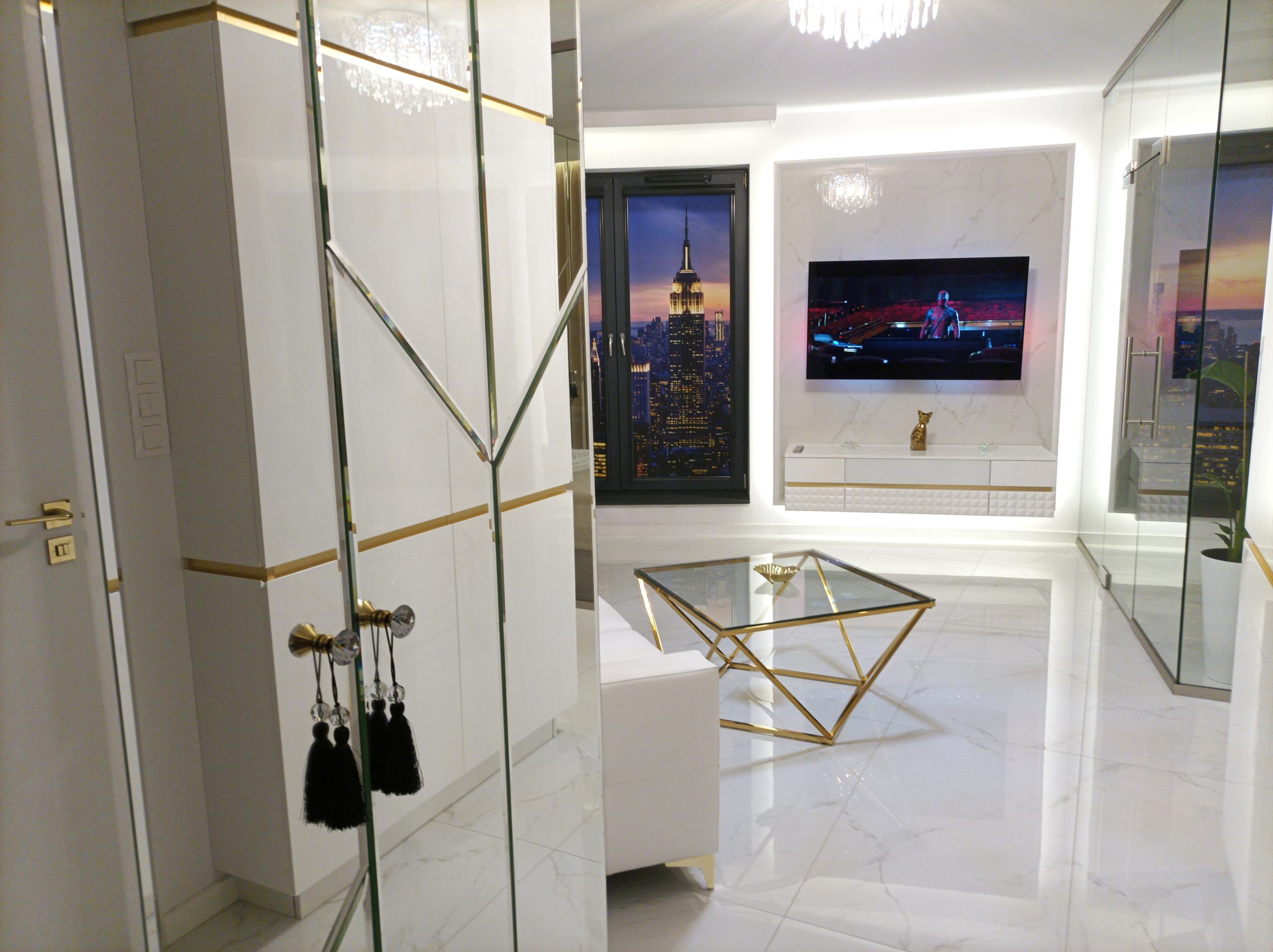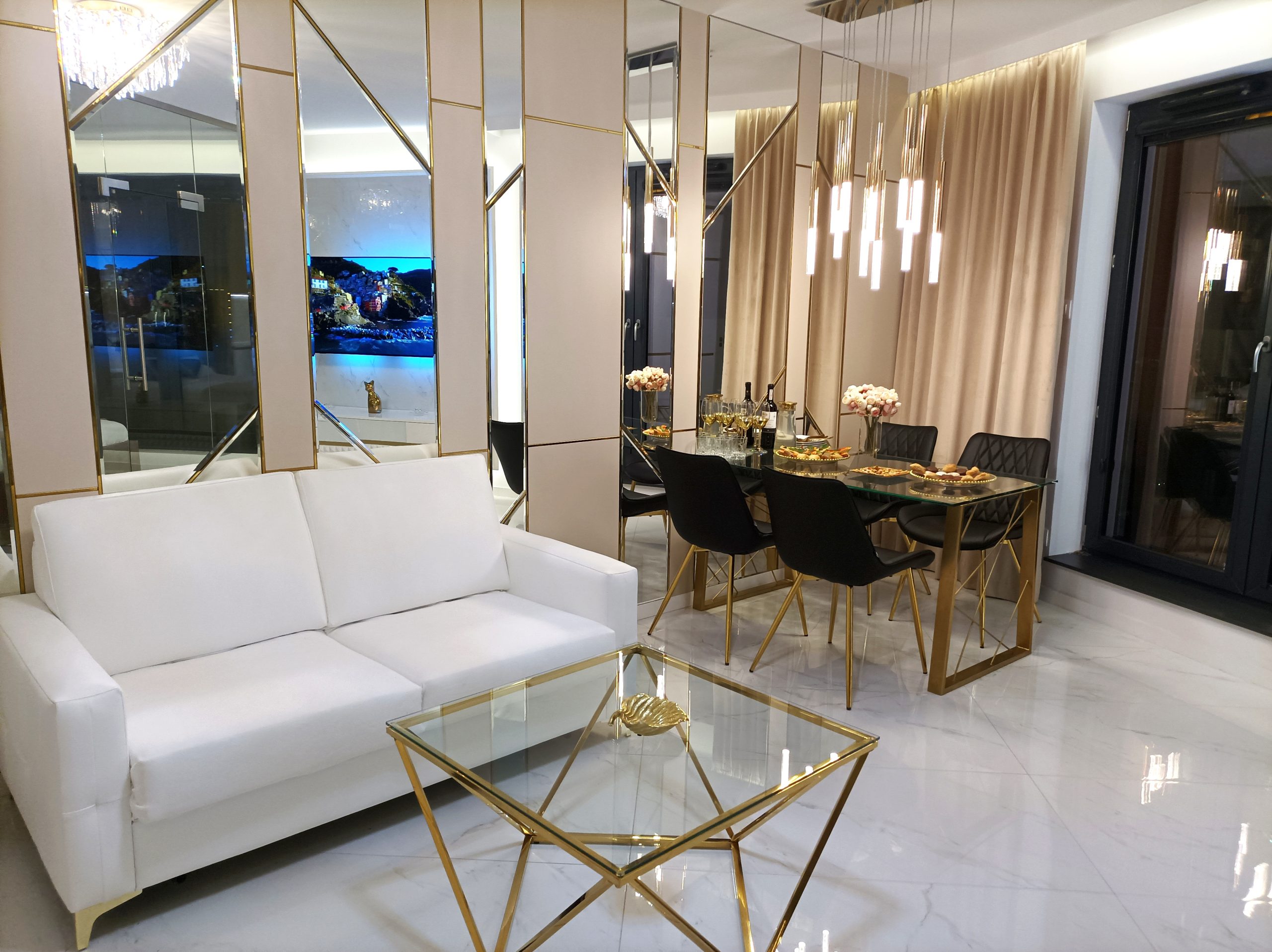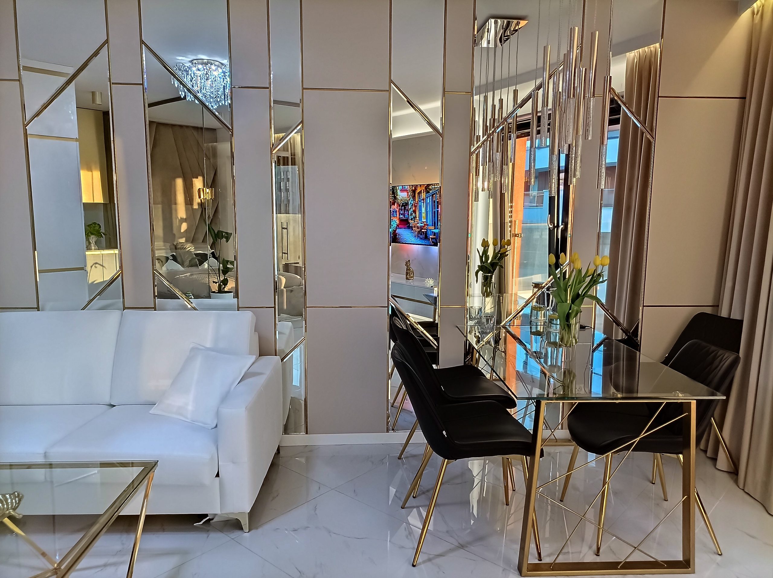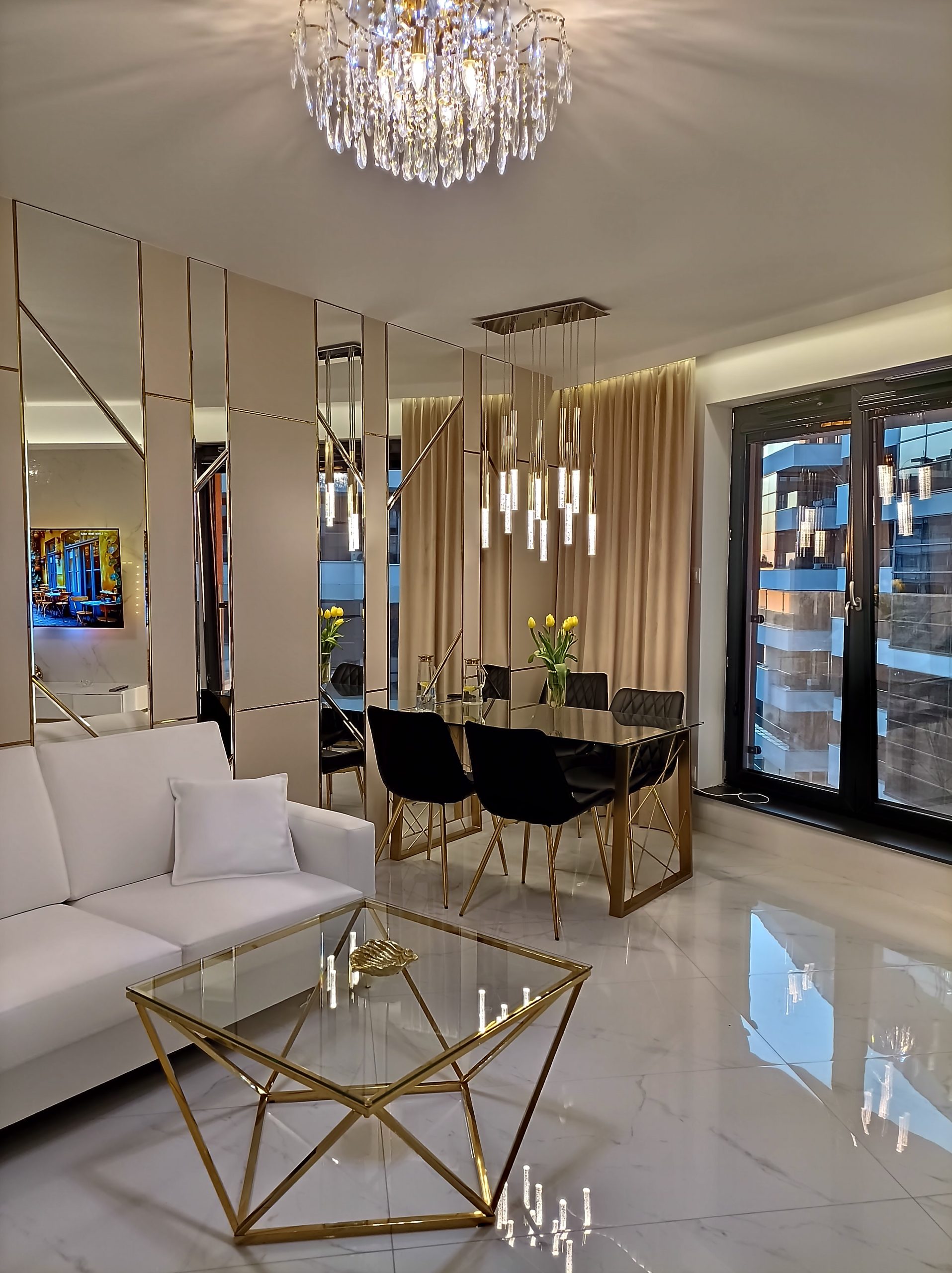 A stunning view of the main living space, highlighting the cohesive white, black, and gold Art Deco design with reflective surfaces to amplify light and space.