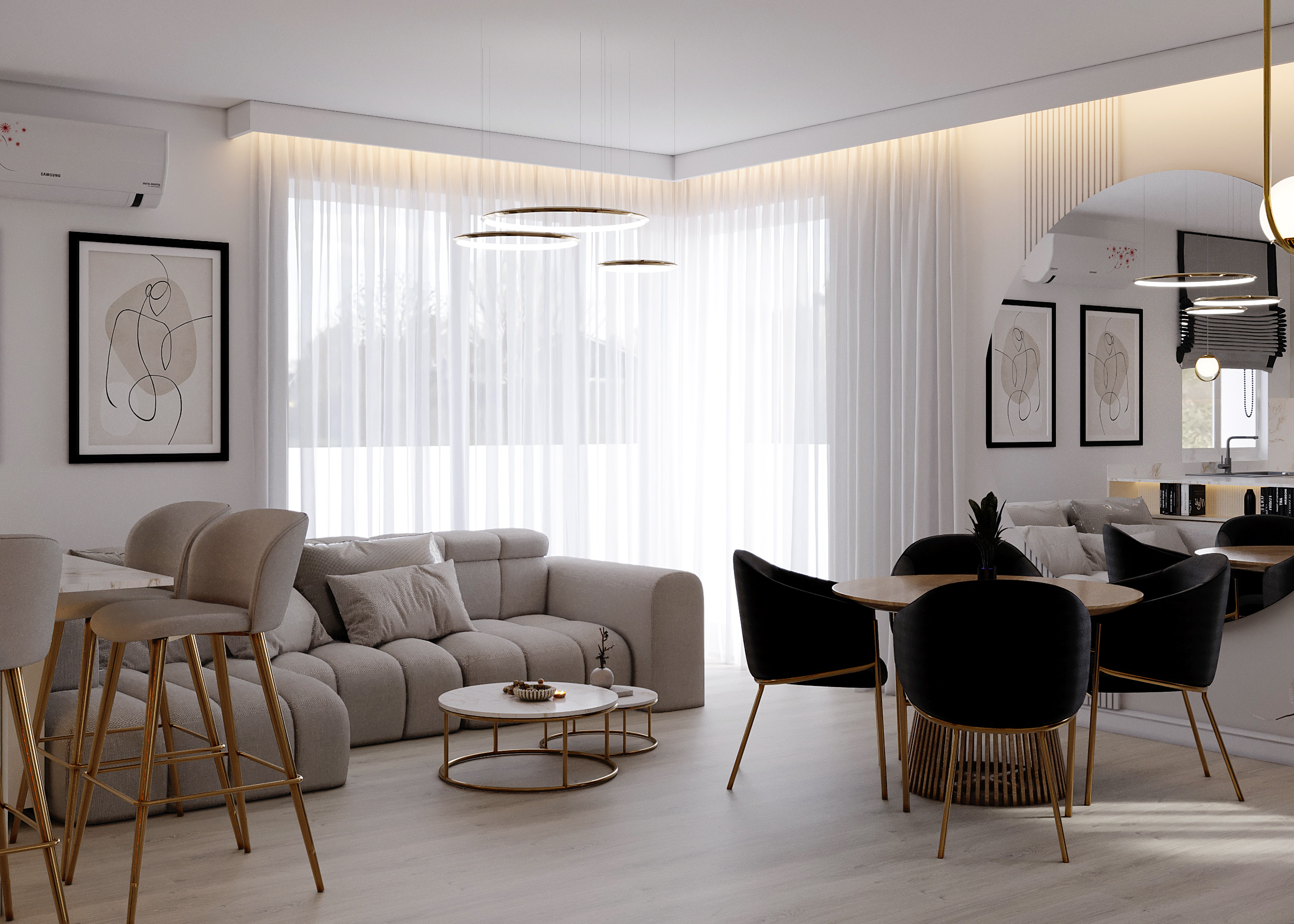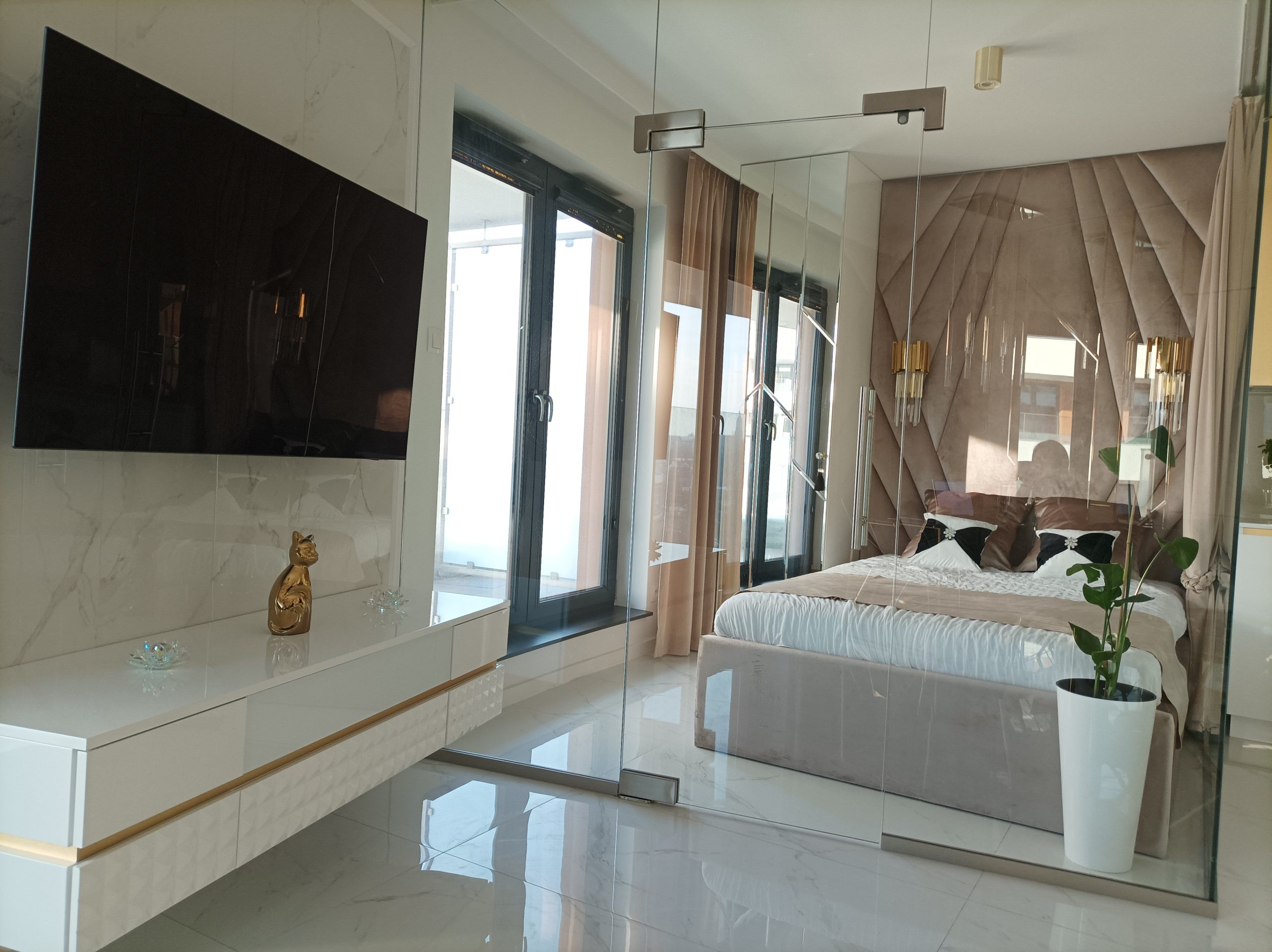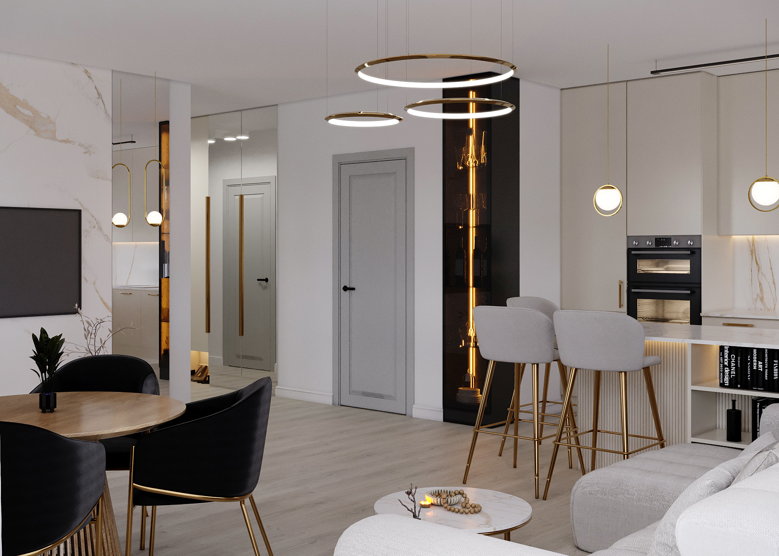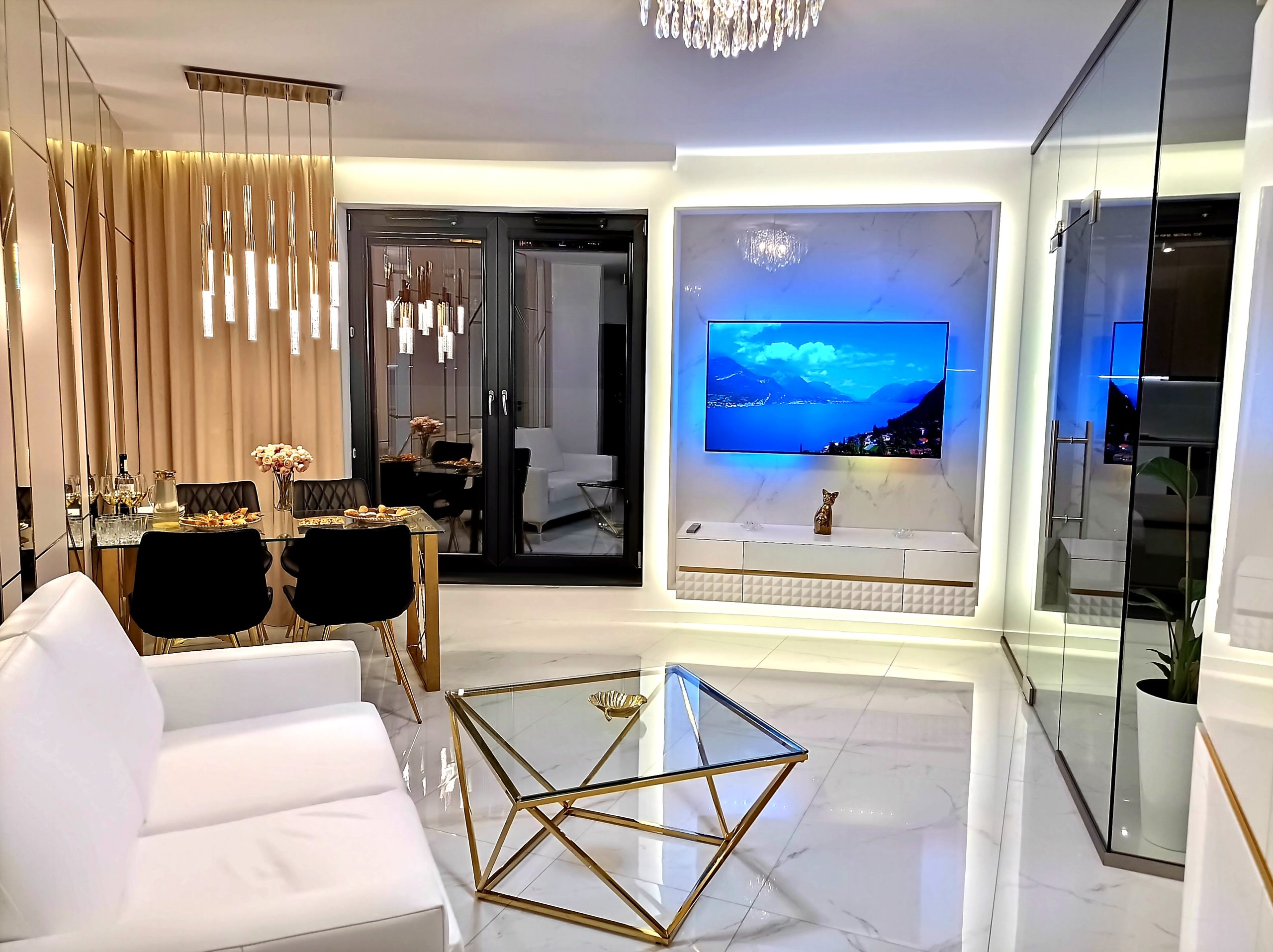 A stunning view of the main living space, highlighting the cohesive white, black, and gold Art Deco design with reflective surfaces to amplify light and space.