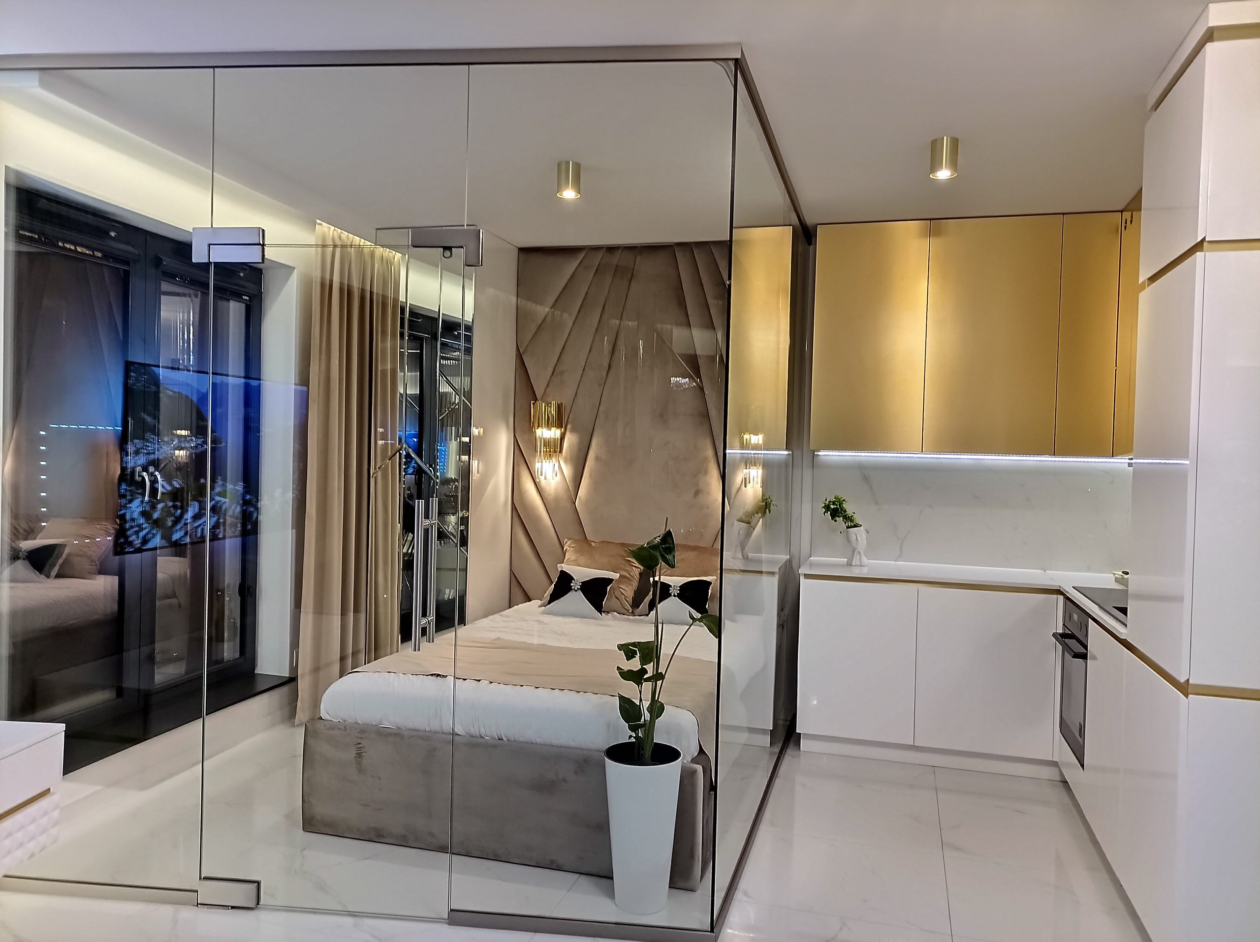 The clever use of a clear glass partition creates an open-plan feel while visually separating the luxurious bedroom nook from the sleek, gold-accented kitchen area.