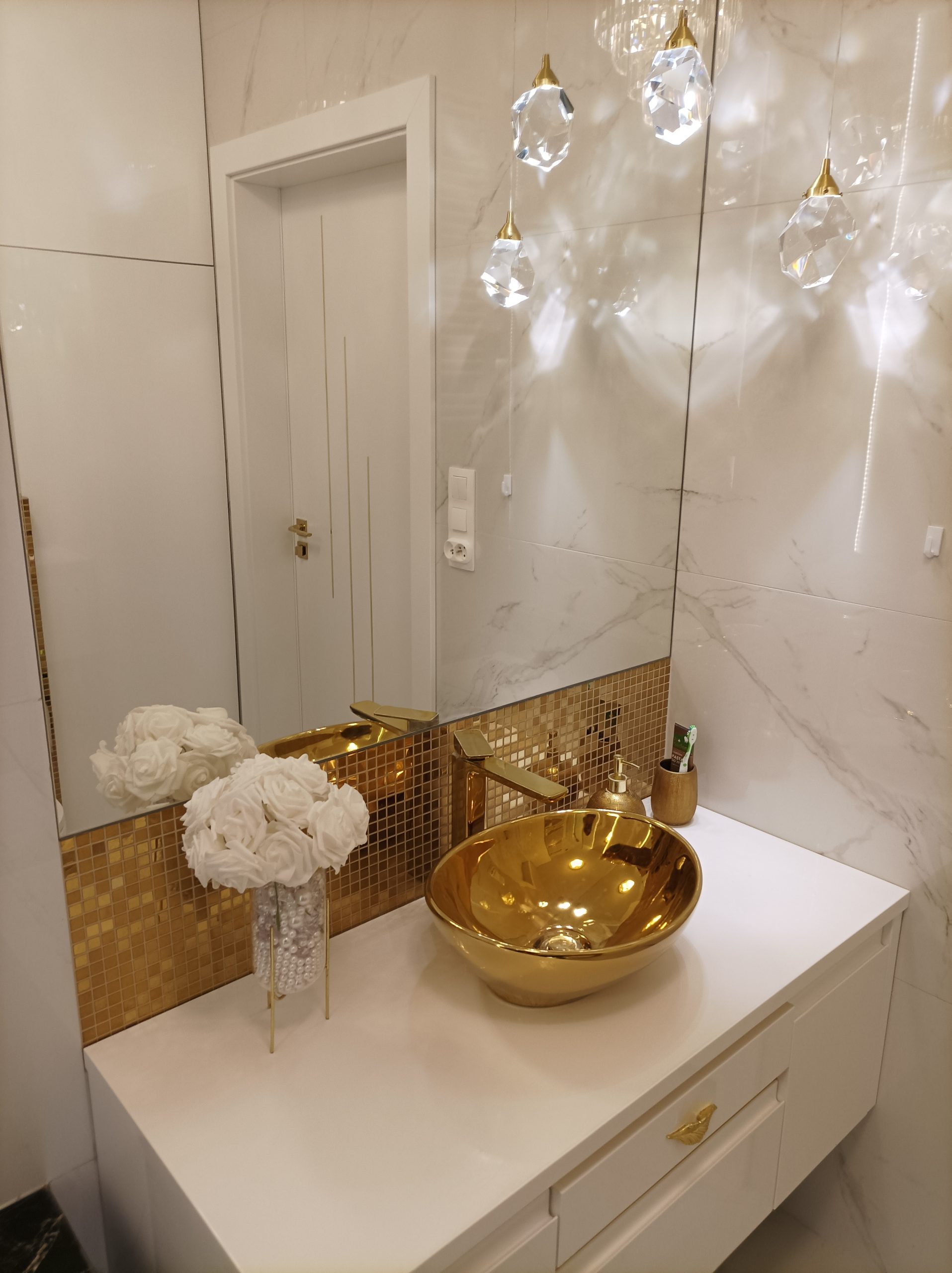 The opulent bathroom makes a statement with a unique golden vessel sink, matching fixtures, and a shimmering gold mosaic tile backsplash.