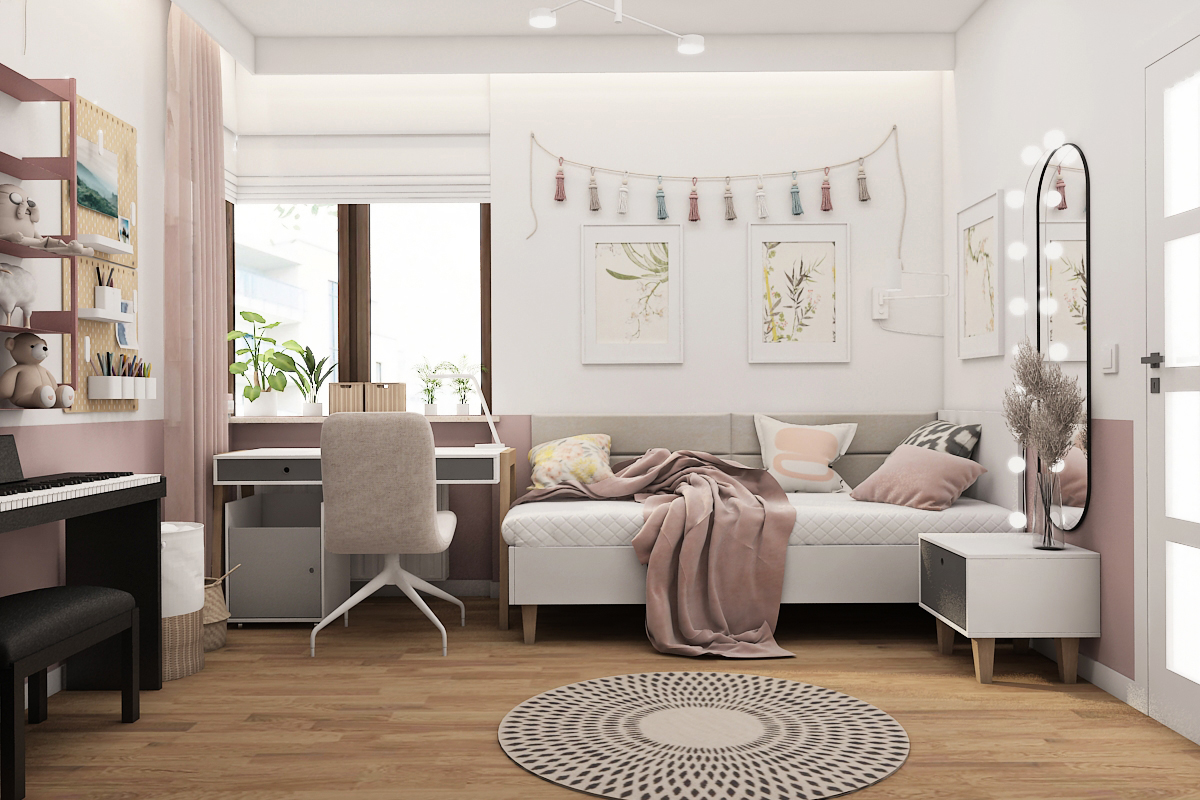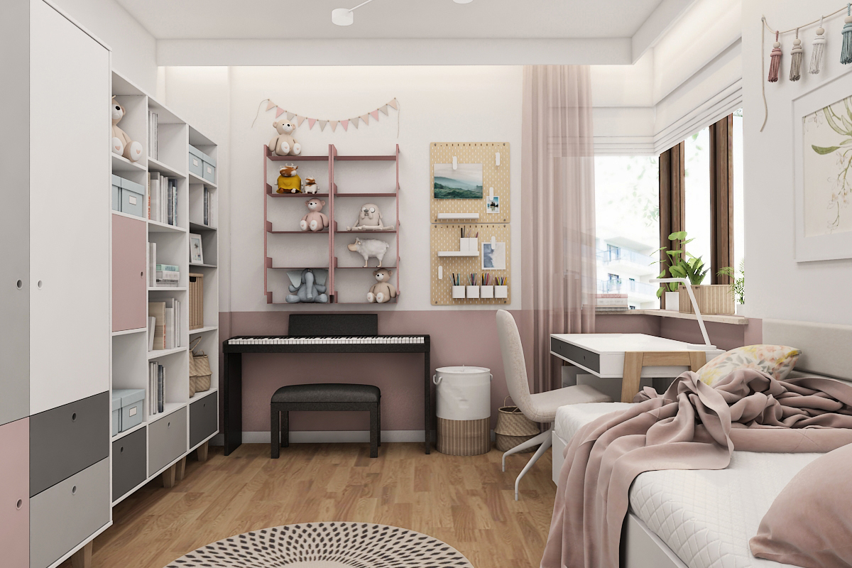 A joyful and functional children’s room, designed with a feature wall of modern, pink slatted paneling and soft pastel colors.
