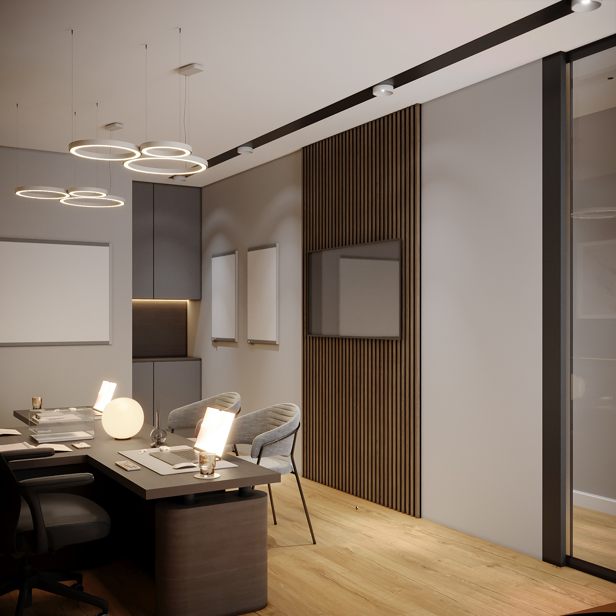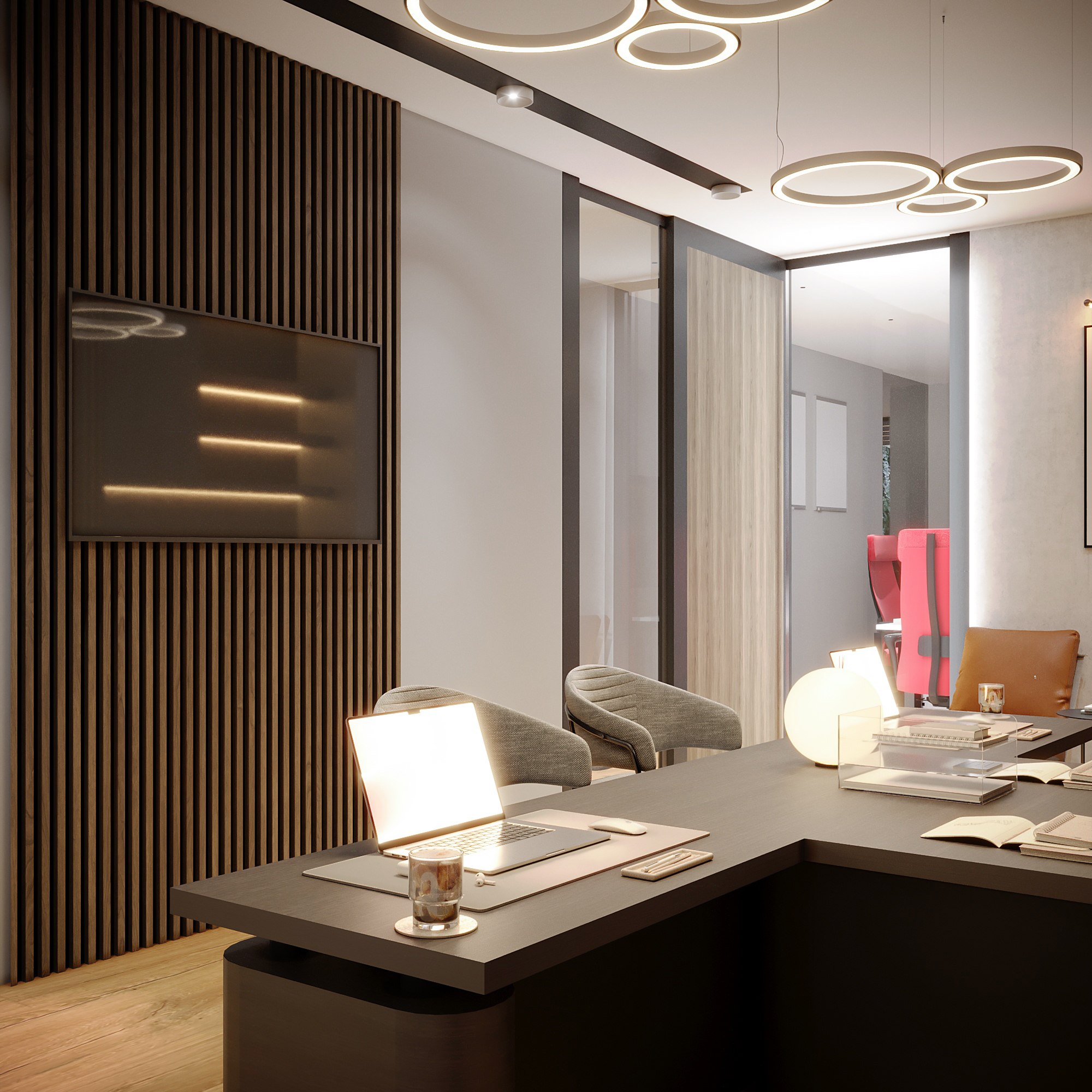 Media Wall Integration: The meeting area features a wall-mounted display set within the wood slat paneling for presentations, maintaining the sleek, contemporary aesthetic.