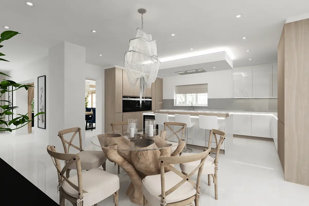 The dining area blends seamlessly with the kitchen, using light wood floors and a statement chrome bubble chandelier as the focal point.