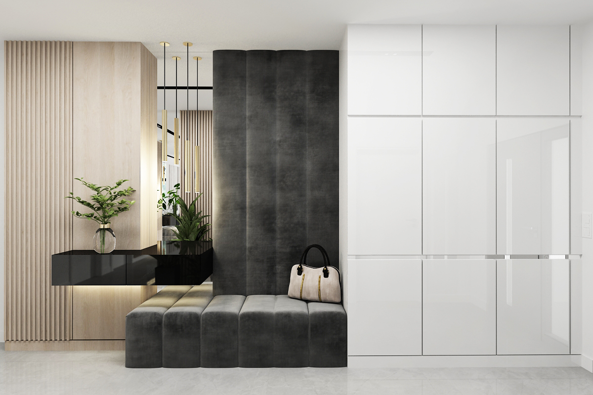Detailing the entry console and storage: sleek, handleless white cabinets paired with a dramatic dark fabric wall panel for textural contrast.