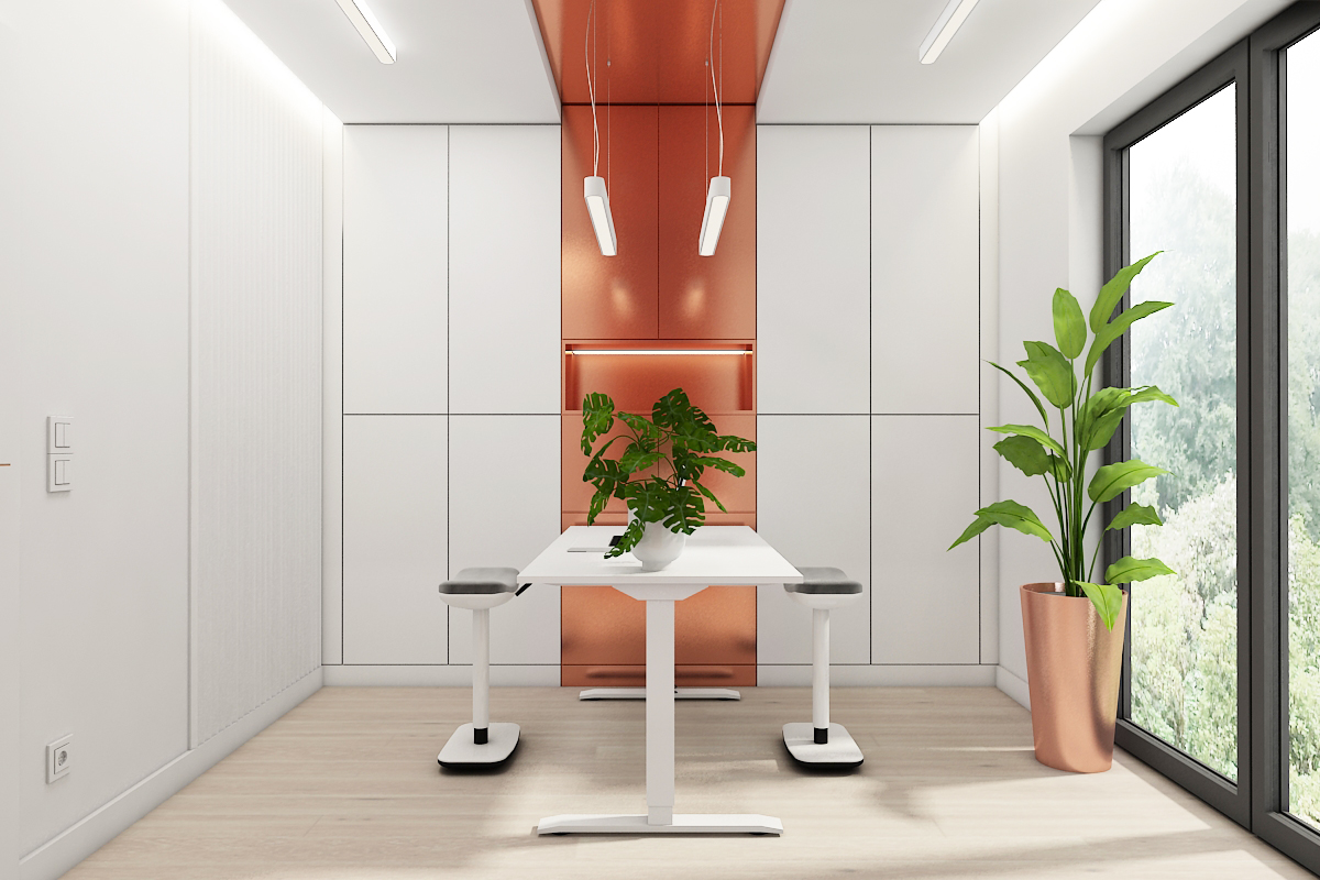 Function meets style in the home office: a striking copper feature wall contrasts with stark white cabinetry and an ergonomic standing desk setup.