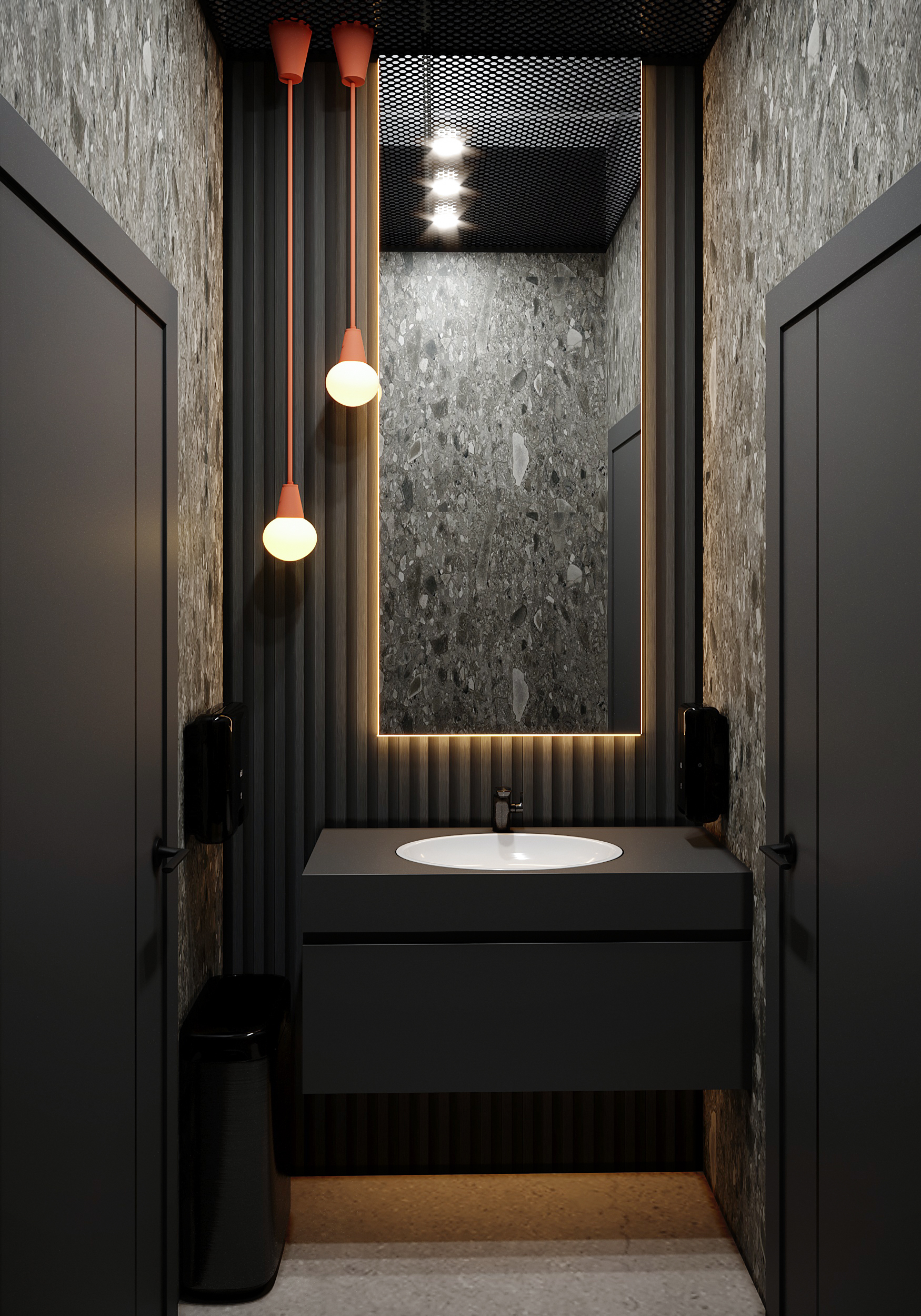 A striking contemporary men’s washroom featuring a minimalist dark vanity, full-height mirror, vertical slat panels, and a pop of color from the hanging light fixtures.