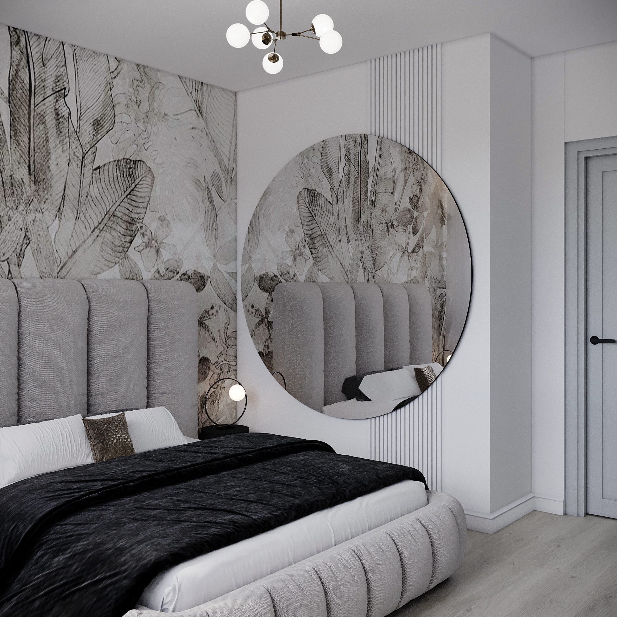 A close-up view highlighting the textures—the vertical channels of the headboard, the bold mural, and the stylish circular mirror.