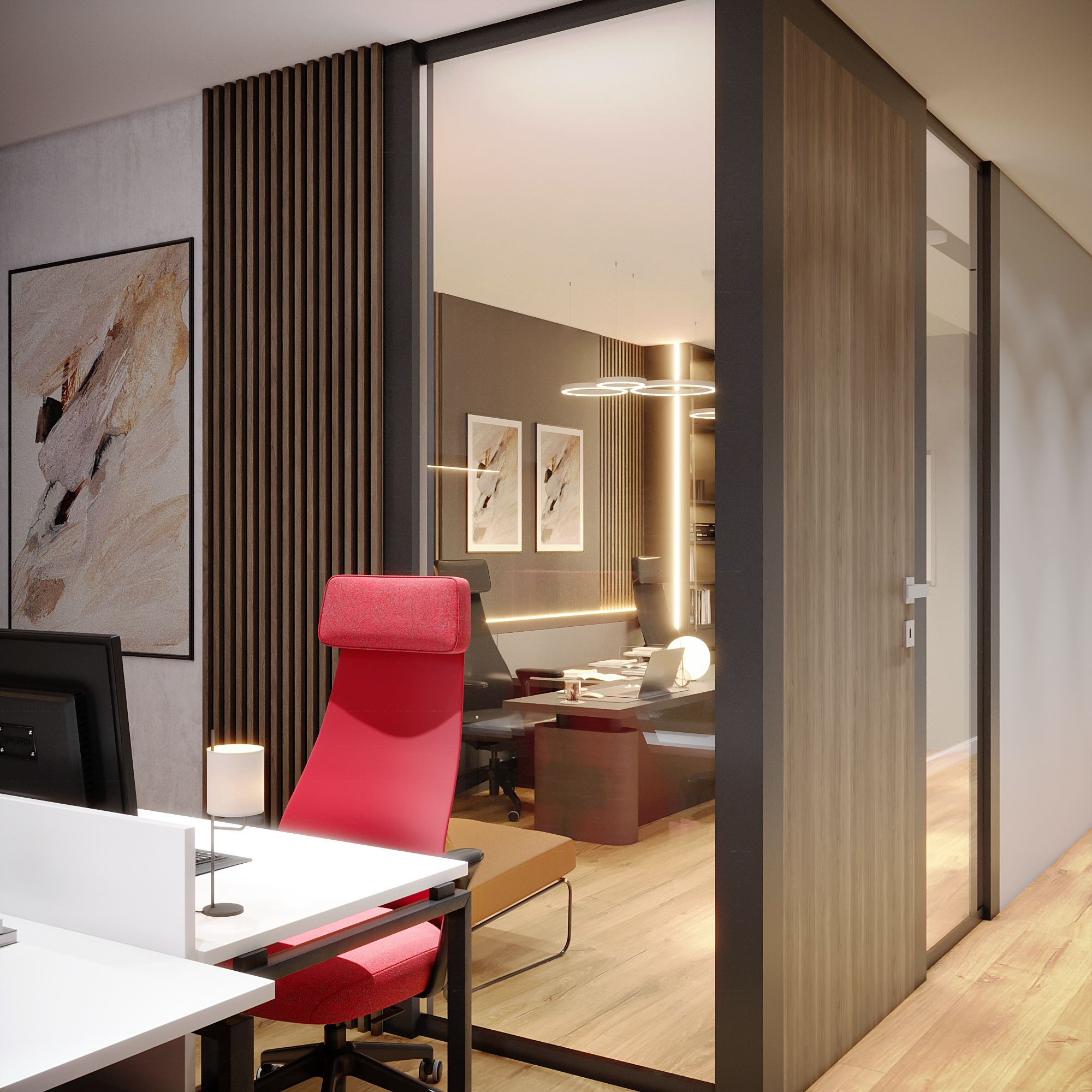 Red Focal Point: The bright red executive chair provides a striking contrast and visual focal point seen through the full-height glass office wall and door.