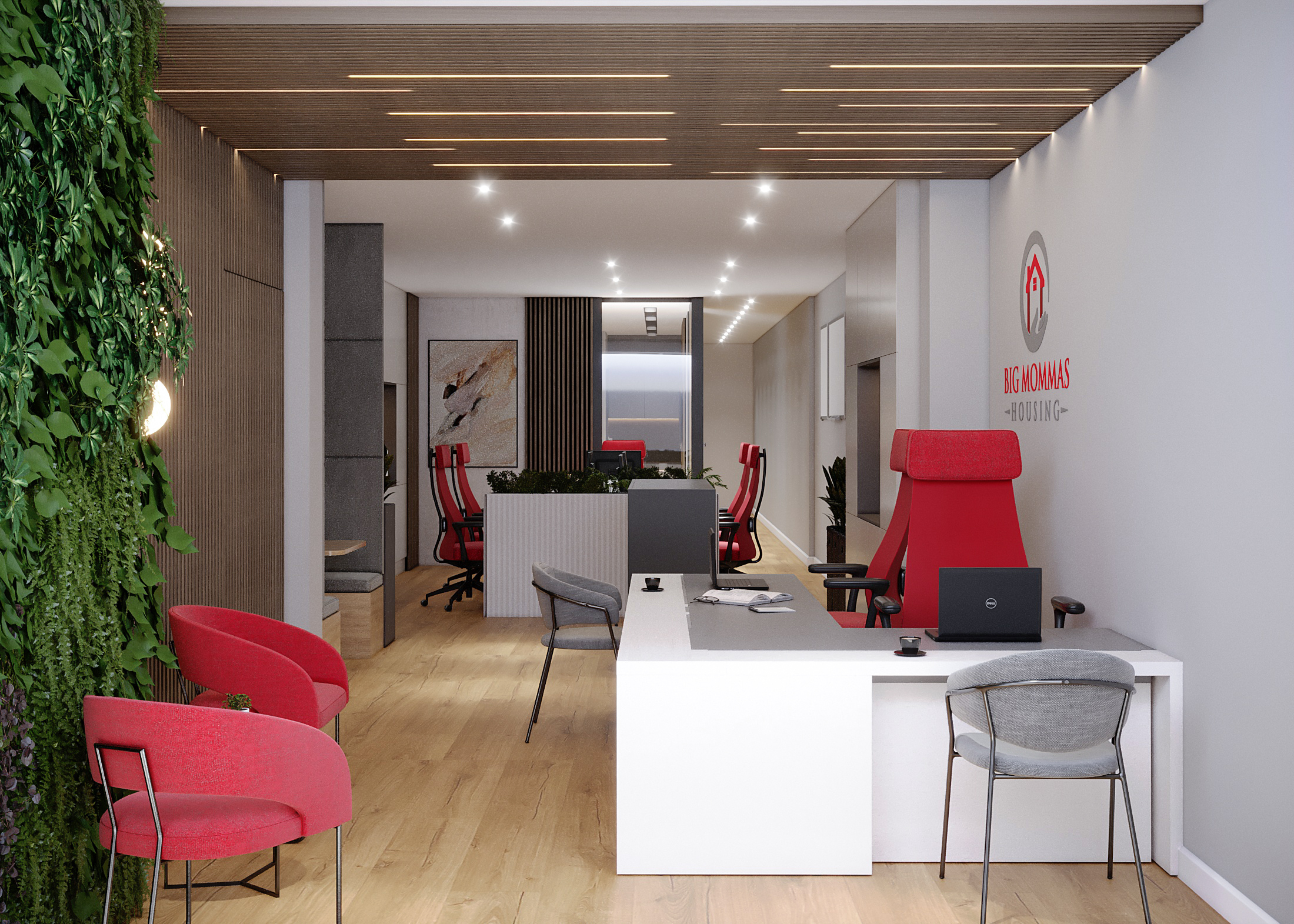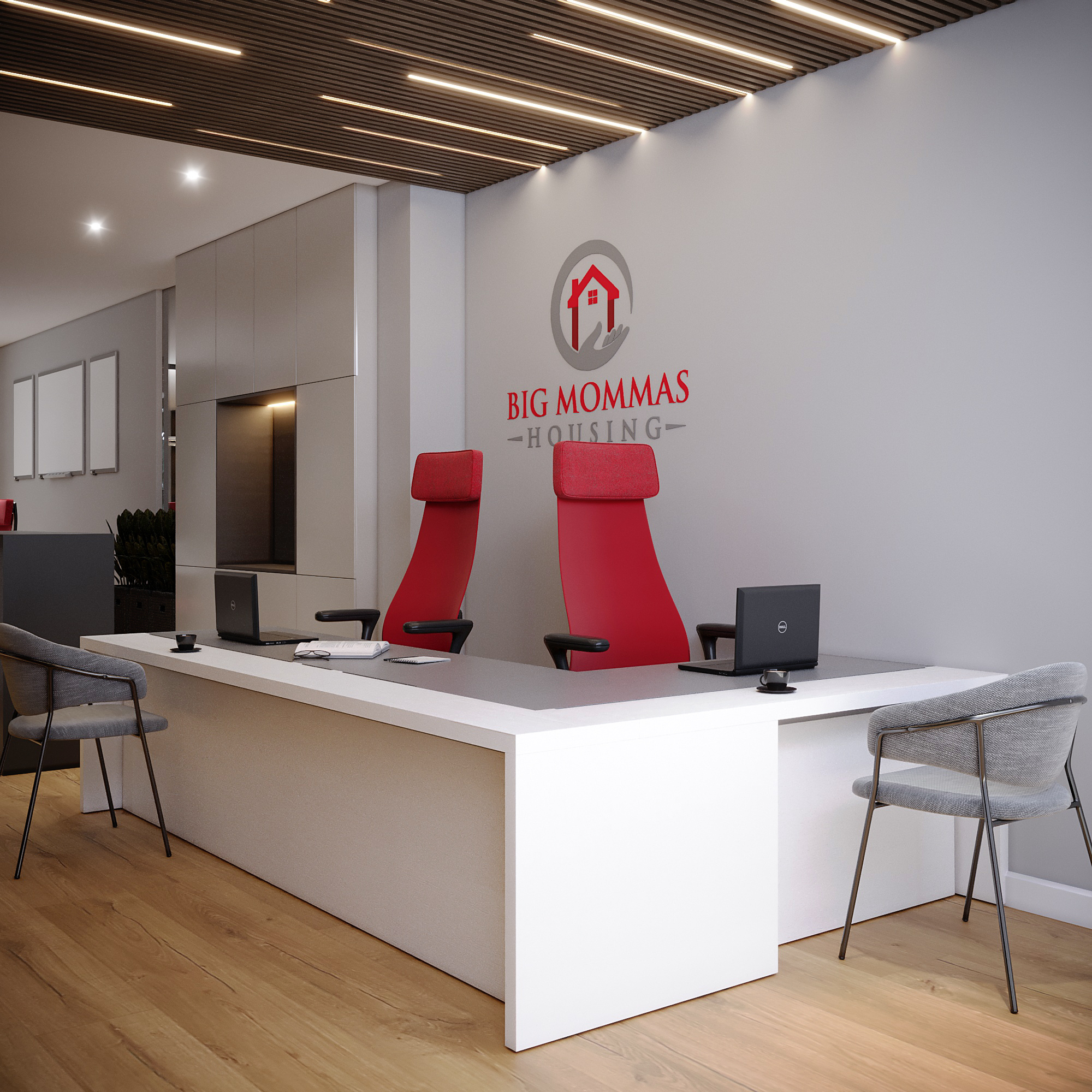 Branded Reception: The main desk area features a clean, white U-shaped desk, high-back red executive chairs, and prominent company logo placement for a professional, focused workspace.