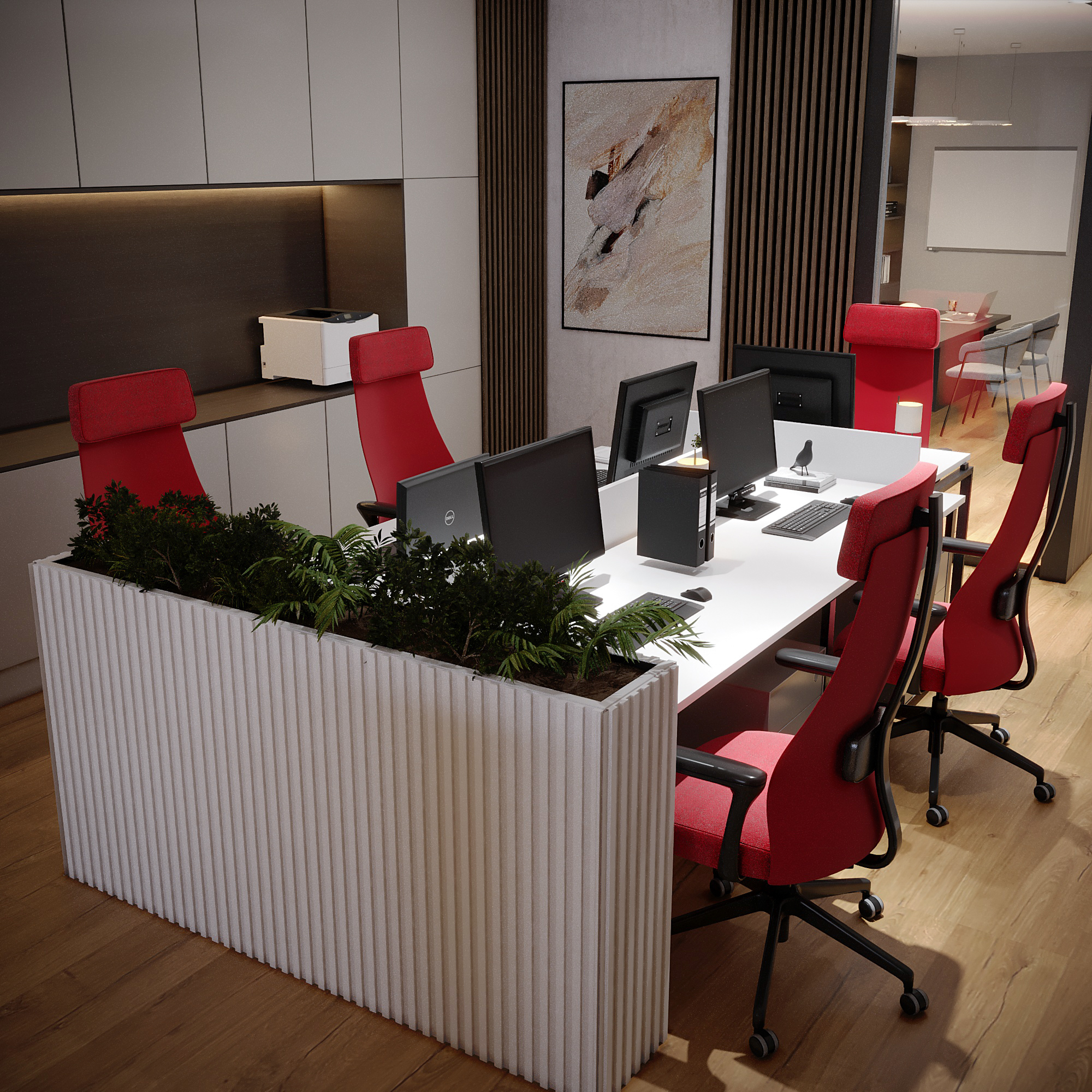 Open-Plan Work Area: A collaborative workspace featuring a long desk, ergonomic red task chairs, and a planter divider to subtly separate and bring greenery to the workstations.
