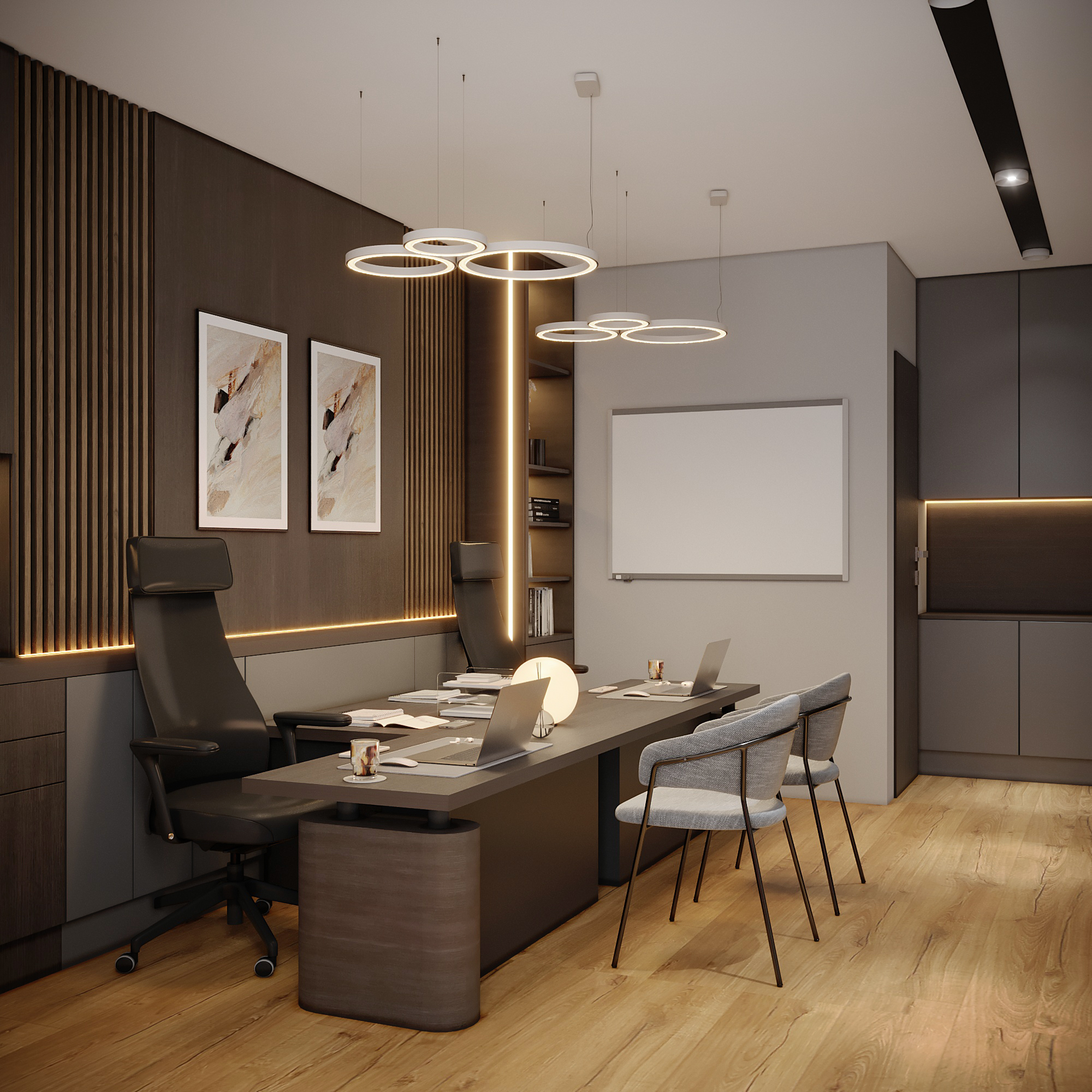 Productive Private Office: A functional space with a large dark executive desk, a mounted whiteboard, and a backdrop of vertical wood slats complemented by minimalist art.